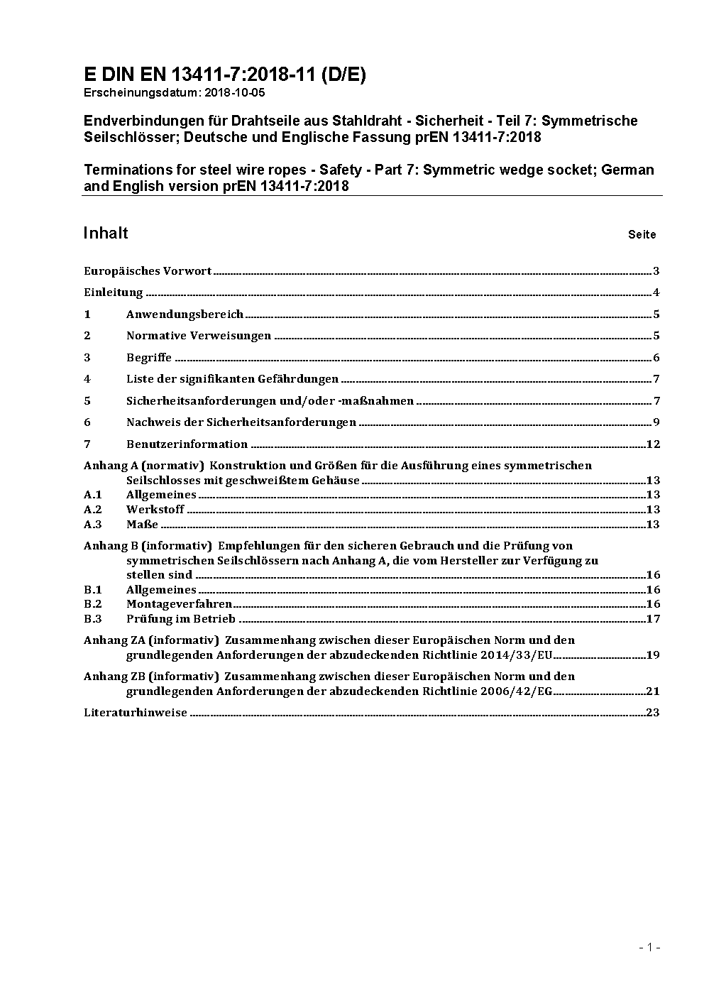 Endverbindungen für Drahtseile aus Stahldraht - Sicherheit - Teil 7: Symmetrische Seilschlösser; Deutsche und Englische Fassung prEN 13411-7:2018