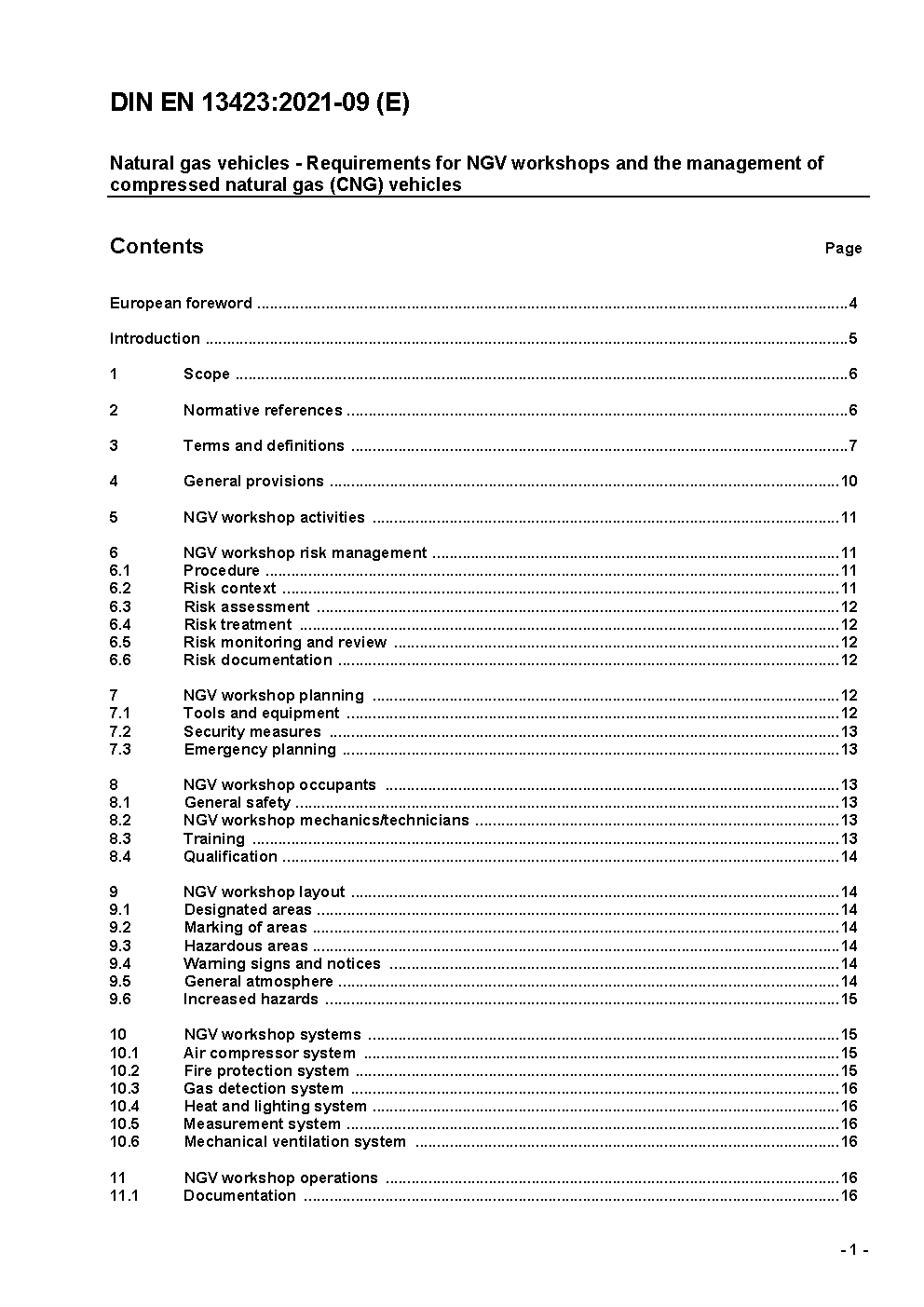 Natural gas vehicles - Requirements for NGV workshops and the management of compressed natural gas (CNG) vehicles; German version EN 13423:2021.