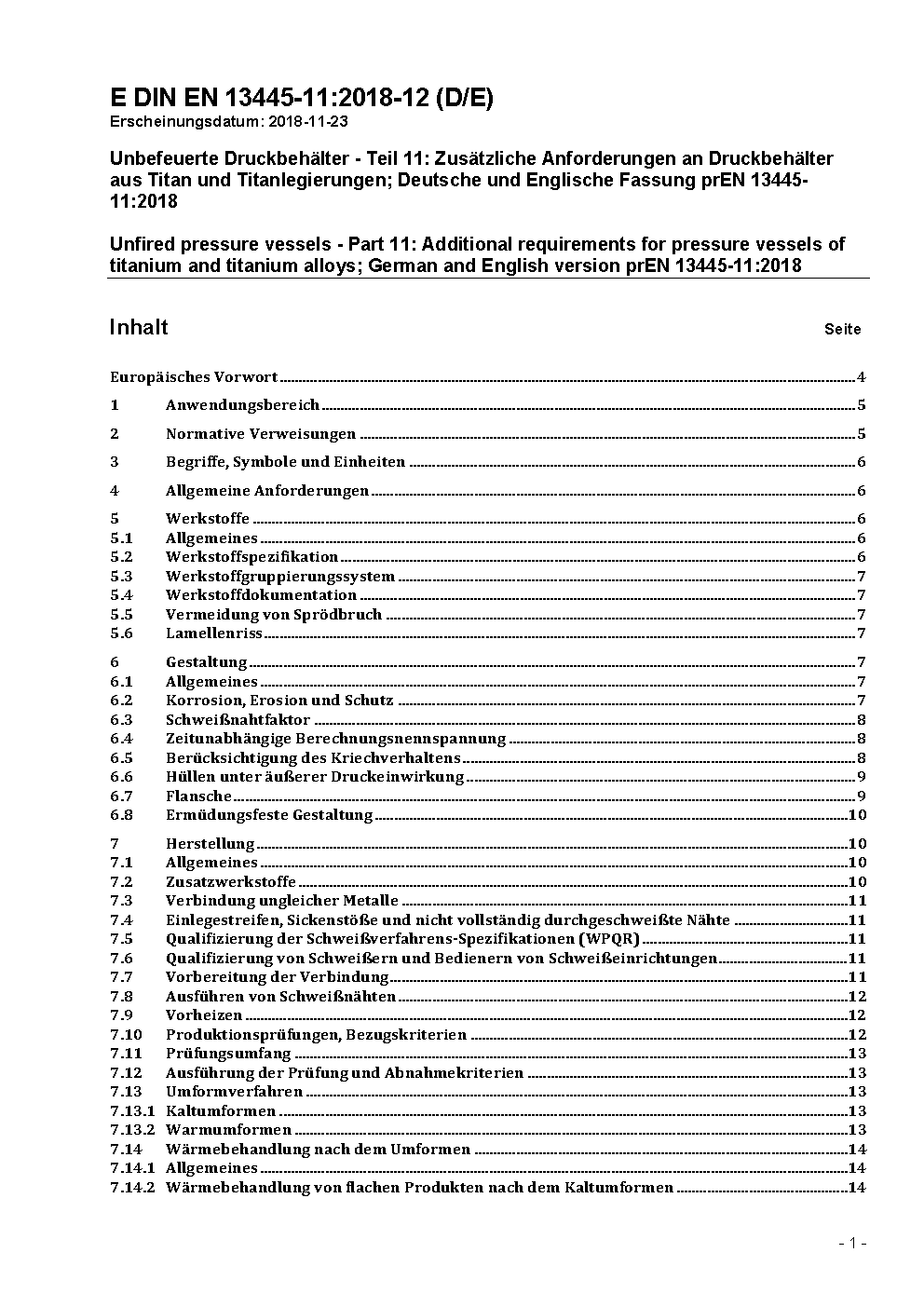 Unbefeuerte Druckbehälter - Teil 11: Zusätzliche Anforderungen an Druckbehälter aus Titan und Titanlegierungen; Deutsche Fassung EN 13445-11:2024