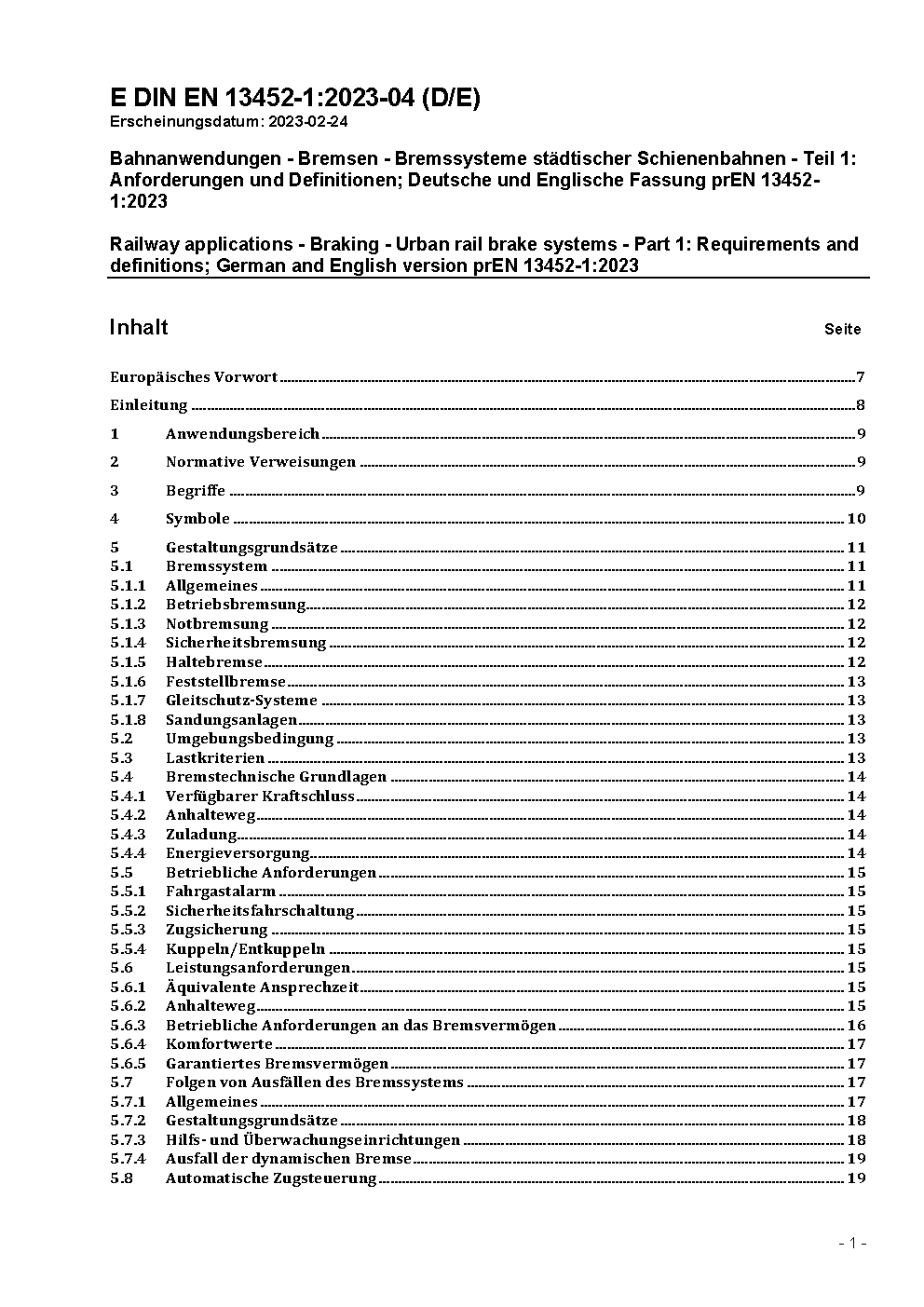 Bahnanwendungen - Bremsen - Bremssysteme des öffentlichen Nahverkehrs - Teil 1: Anforderungen an das Leistungsvermögen; Deutsche Fassung EN 13452-1:2003