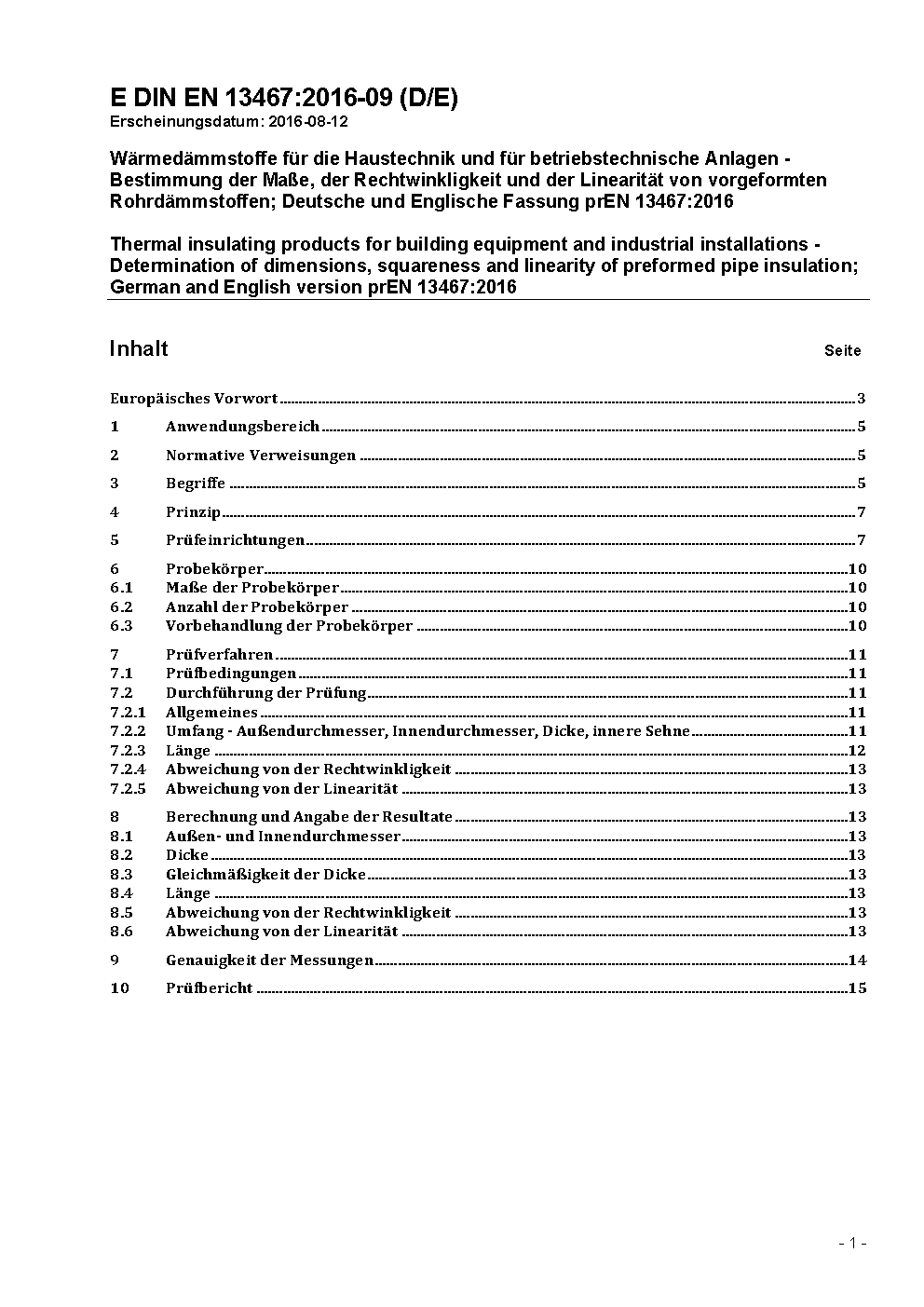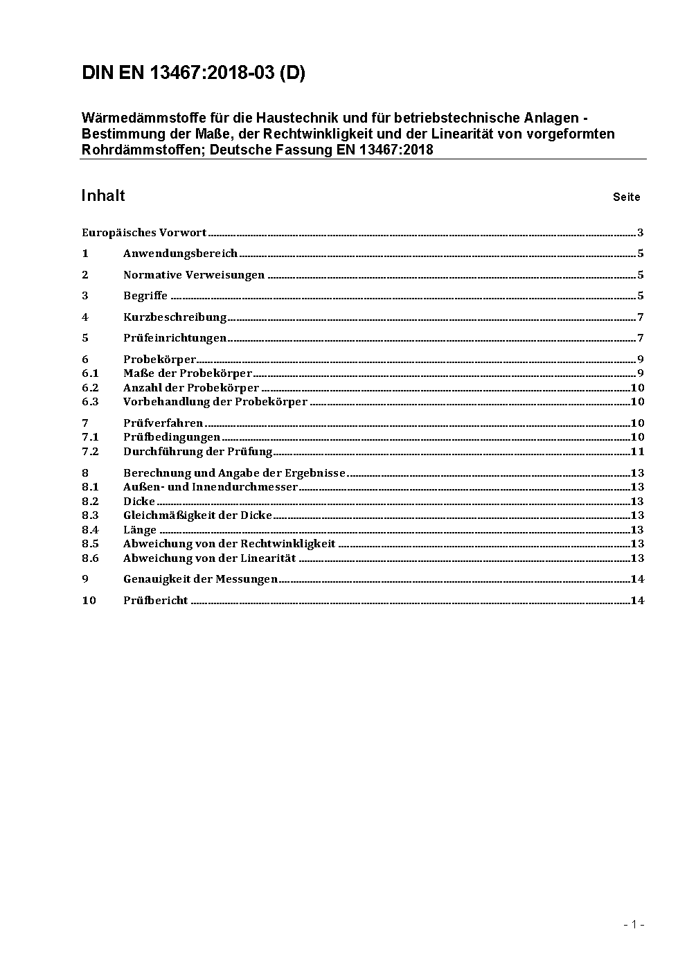 Wärmedämmstoffe für die Haustechnik und für betriebstechnische Anlagen - Bestimmung der Maße, der Rechtwinkligkeit und der Linearität von vorgeformten Rohrdämmstoffen; Deutsche Fassung EN 13467:2018