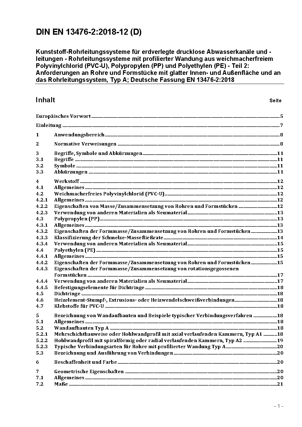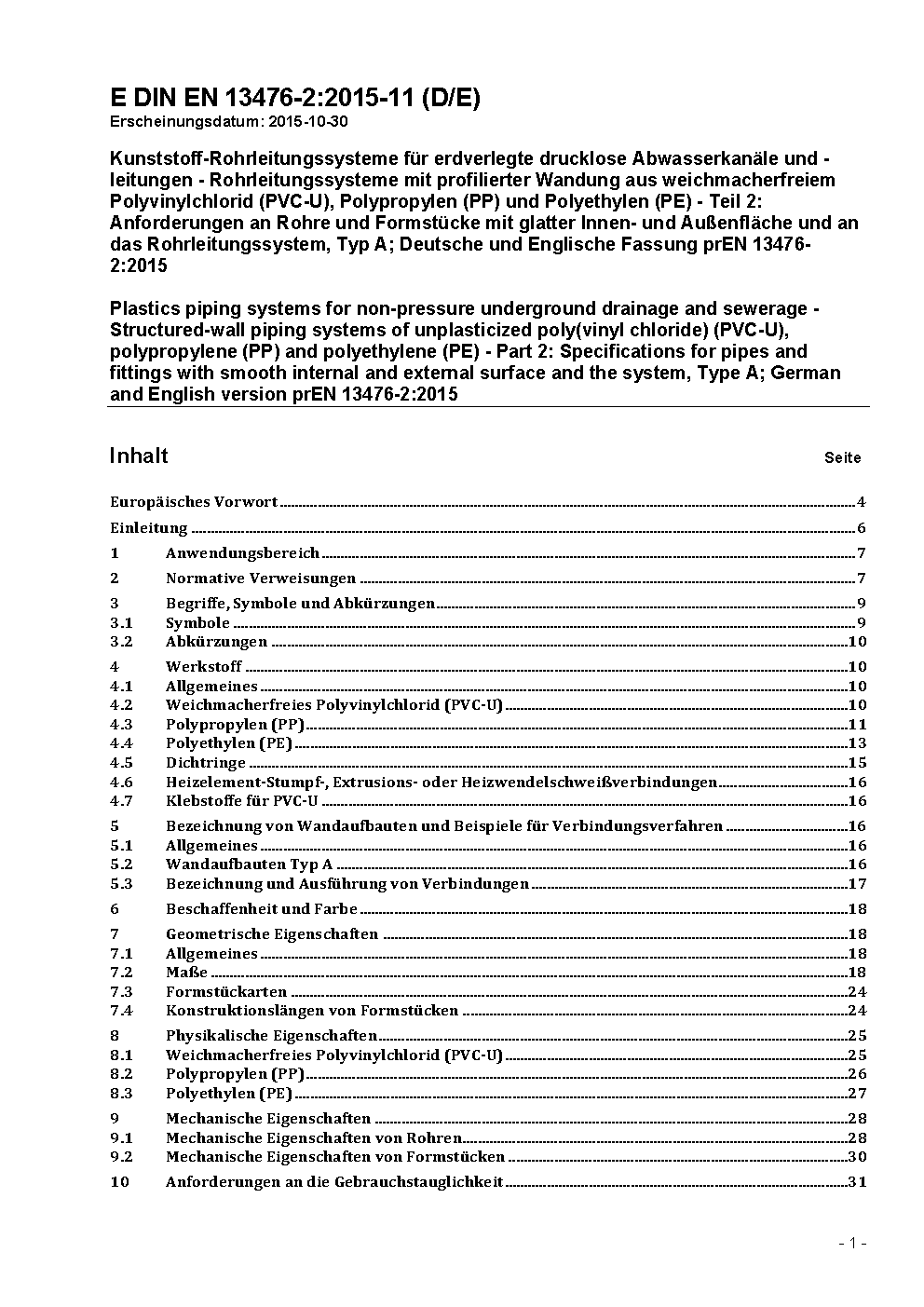 Kunststoff-Rohrleitungssysteme für erdverlegte drucklose Abwasserkanäle und -leitungen - Rohrleitungssysteme mit profilierter Wandung aus weichmacherfreiem Polyvinylchlorid (PVC-U), Polypropylen (PP) und Polyethylen (PE) - Teil 2: Anforderungen an Rohre und Formstücke mit glatter Innen- und Außenfläche und an das Rohrleitungssystem, Typ A; Deutsche und Englische Fassung prEN 13476-2:2016