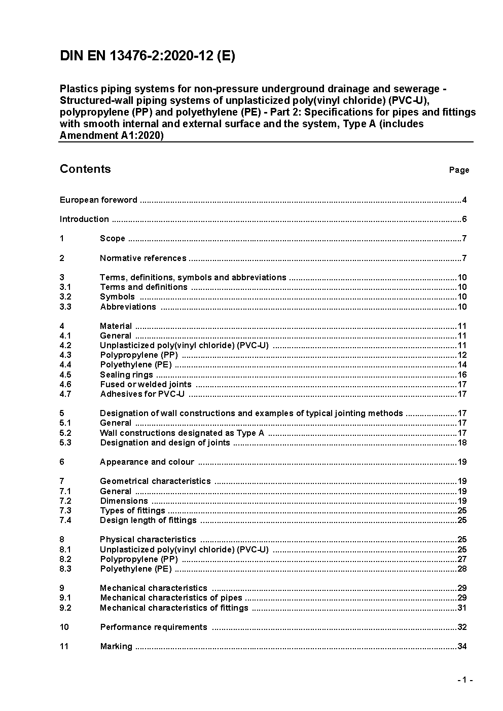 Plastics piping systems for non-pressure underground drainage and sewerage - Structured-wall piping systems of unplasticized poly(vinyl chloride) (PVC-U), polypropylene (PP) and polyethylene (PE) - Part 2: Specifications for pipes and fittings with smooth internal and external surface and the system, Type A; German and English version prEN 13476-2:2016