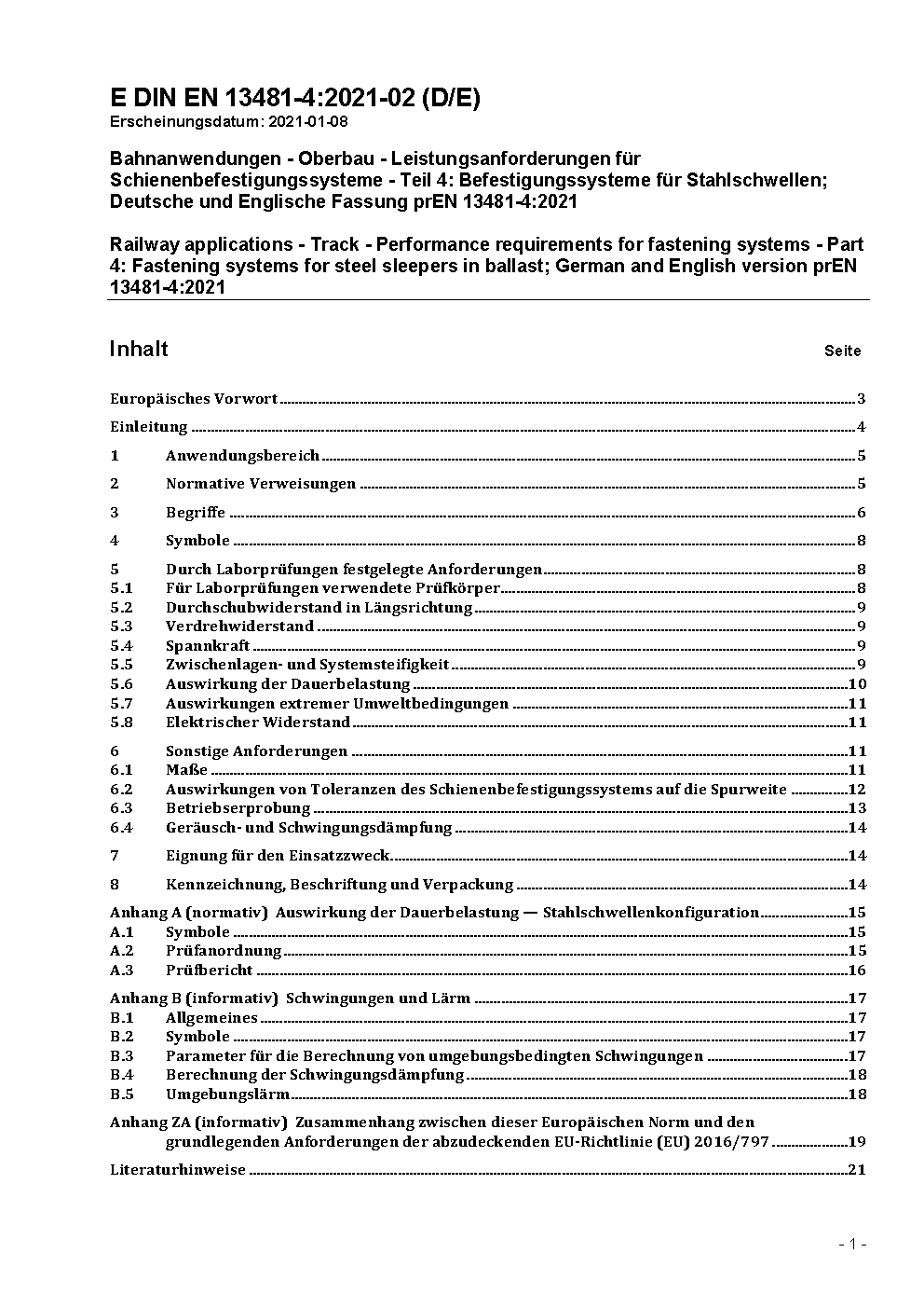 Railway applications - Track; Performance requirements for fastening systems - Part 4: Fastening systems for steel sleepers; German version EN 13481-4:2002