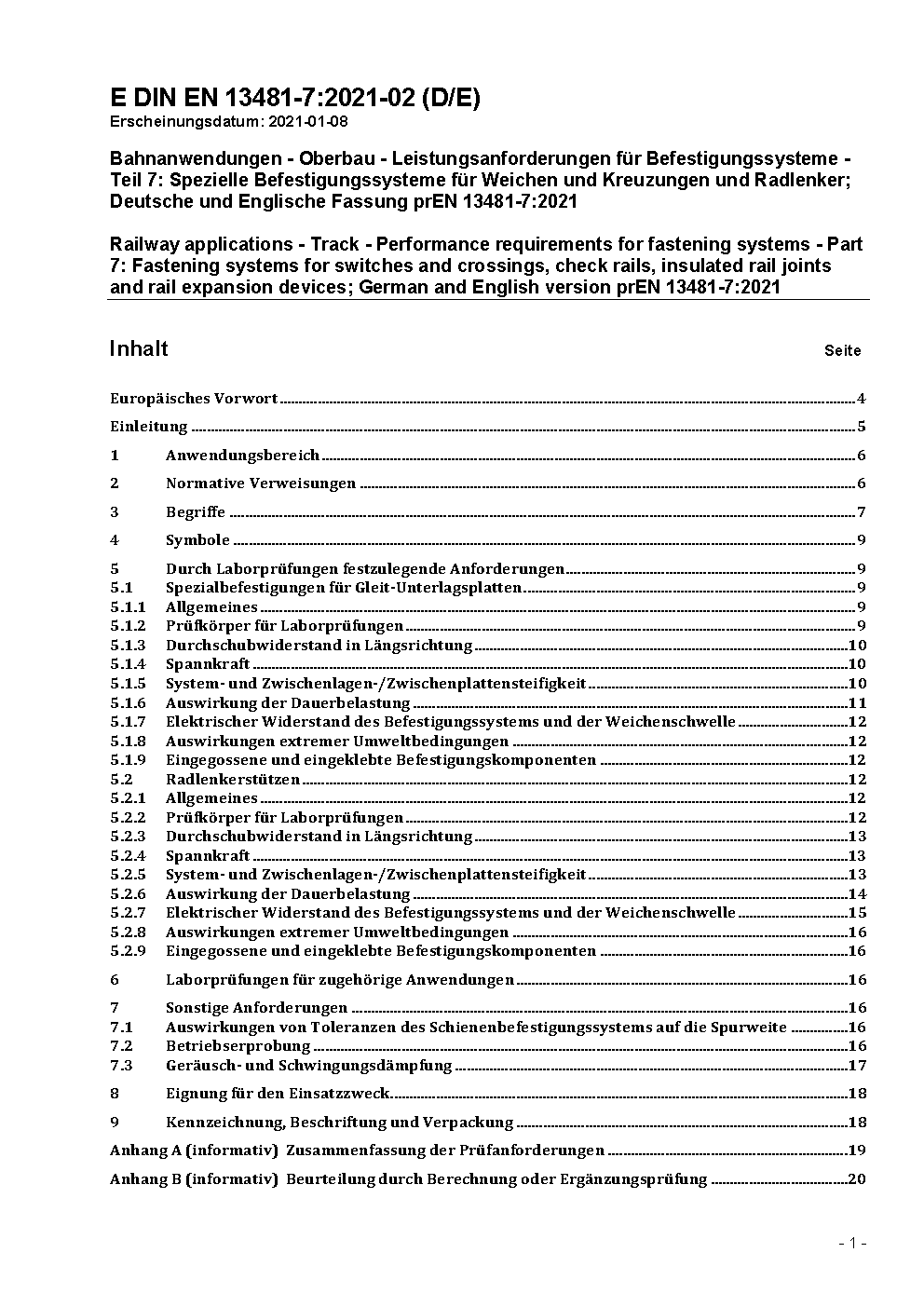 Bahnanwendungen - Oberbau; Leistungsanforderungen für Befestigungssysteme - Teil 7: Spezielle Befestigungssysteme für Weichen und Kreuzungen sowie Führungsschienen; Deutsche Fassung EN 13481-7:2003