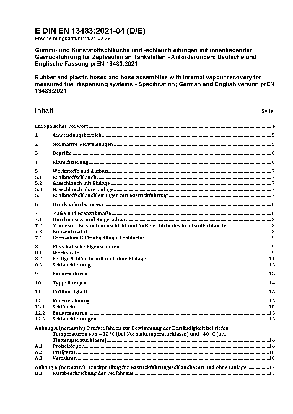 Gummi- und Kunststoffschläuche und -schlauchleitungen mit innenliegender Gasrückführung für Zapfsäulen an Tankstellen - Anforderungen; Deutsche Fassung EN 13483:2013