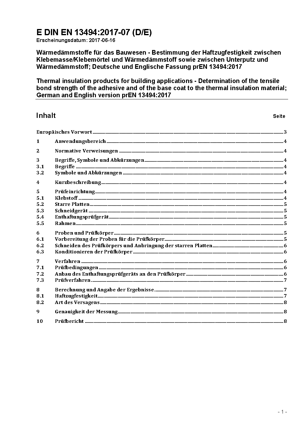 Wärmedämmstoffe für das Bauwesen - Bestimmung der Haftzugfestigkeit zwischen Klebemasse/Klebemörtel und Wärmedämmstoff sowie zwischen Unterputz und Wärmedämmstoff; Deutsche Fassung EN 13494:2002