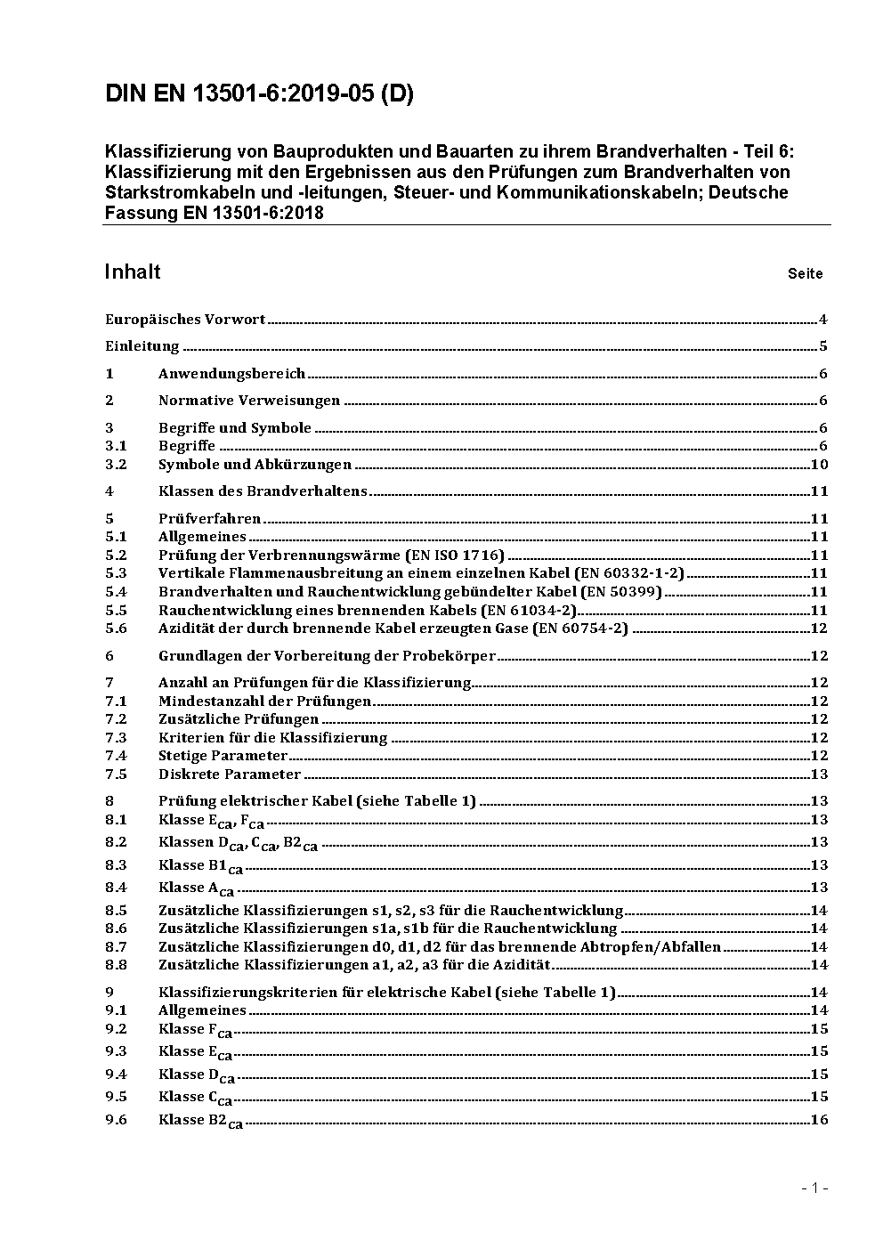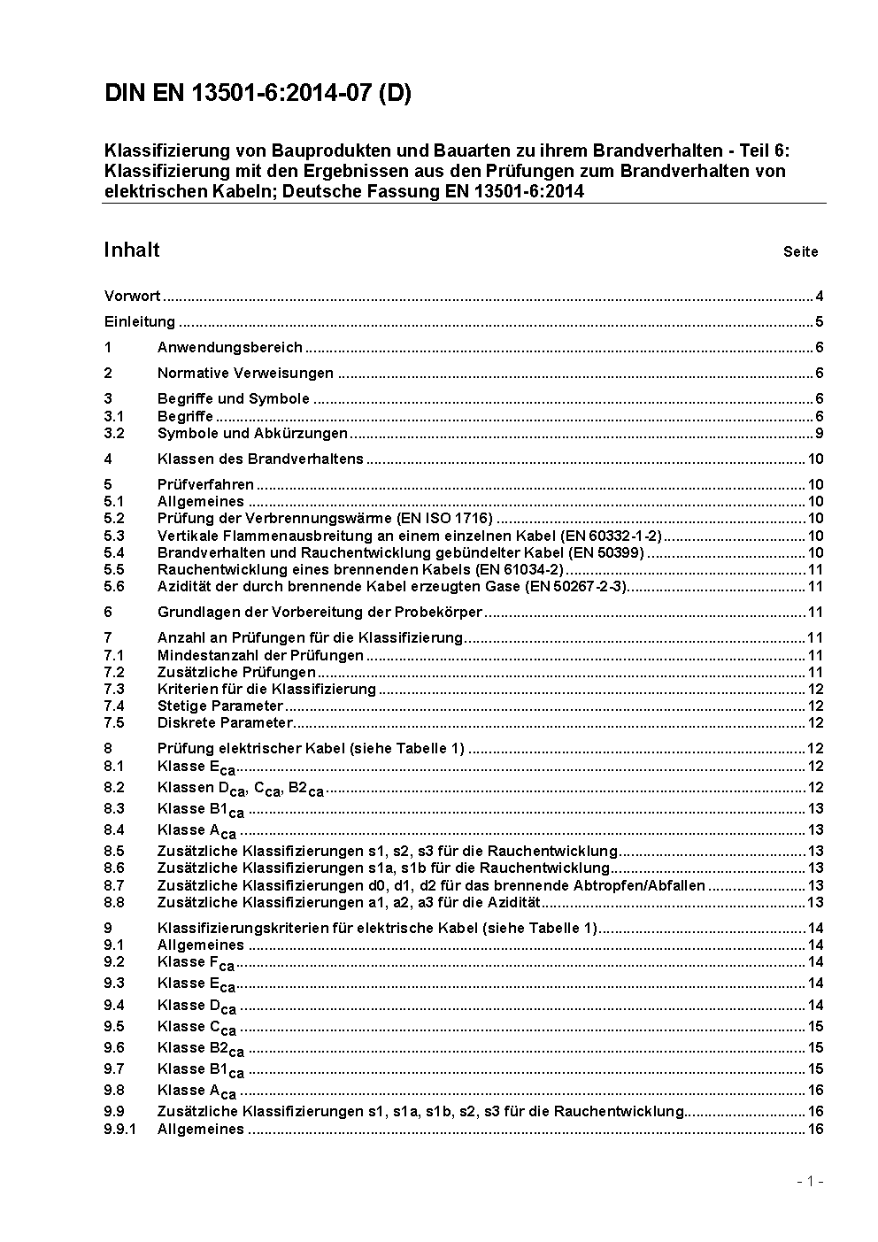 Klassifizierung von Bauprodukten und Bauarten zu ihrem Brandverhalten - Teil 6: Klassifizierung mit den Ergebnissen aus den Prüfungen zum Brandverhalten von elektrischen Kabeln; Deutsche Fassung EN 13501-6:2014