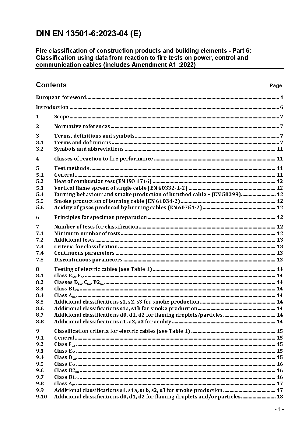 Fire classification of construction products and building elements - Part 6: Classification using data from reaction to fire tests on electric cables; German version EN 13501-6:2014
