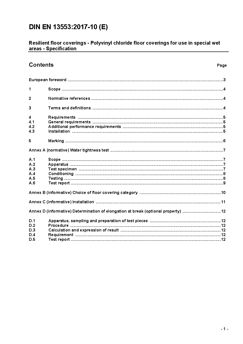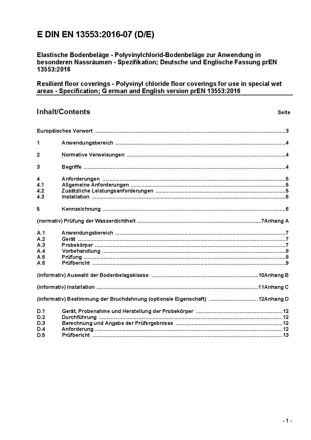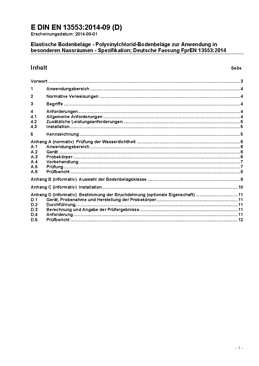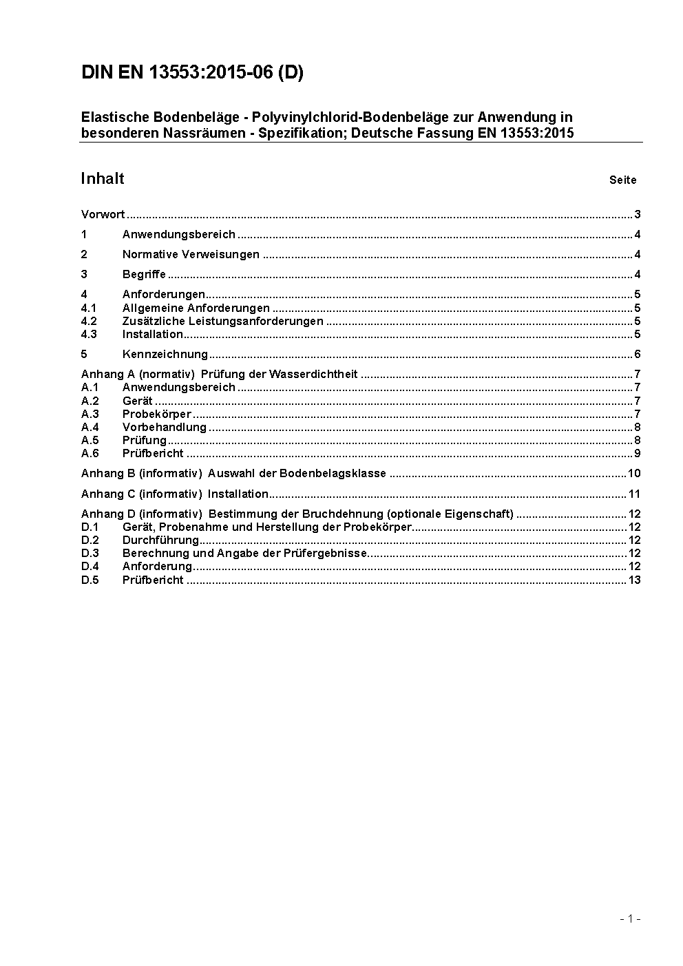 Elastische Bodenbeläge - Polyvinylchlorid-Bodenbeläge zur Anwendung in besonderen Nassräumen - Spezifikation; Deutsche Fassung EN 13553:2002