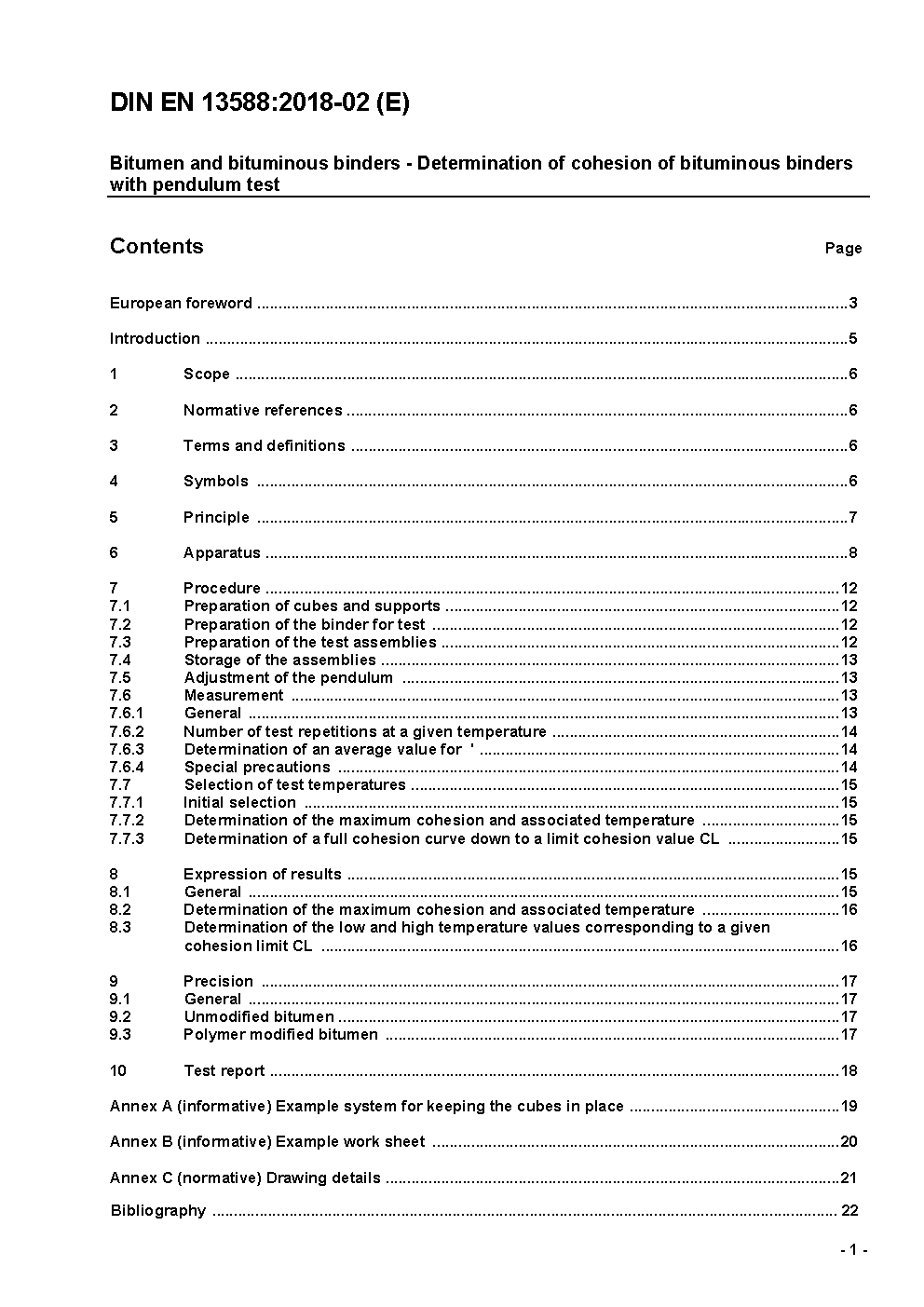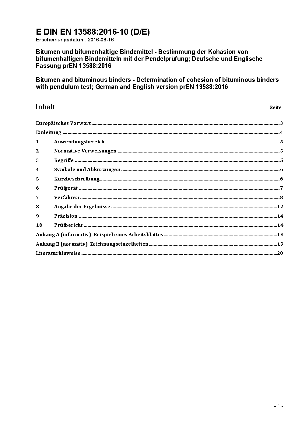 Bitumen und bitumenhaltige Bindemittel - Bestimmung der Kohäsion von bitumenhaltigen Bindemitteln mit der Pendelprüfung; Deutsche Fassung EN 13588:2008