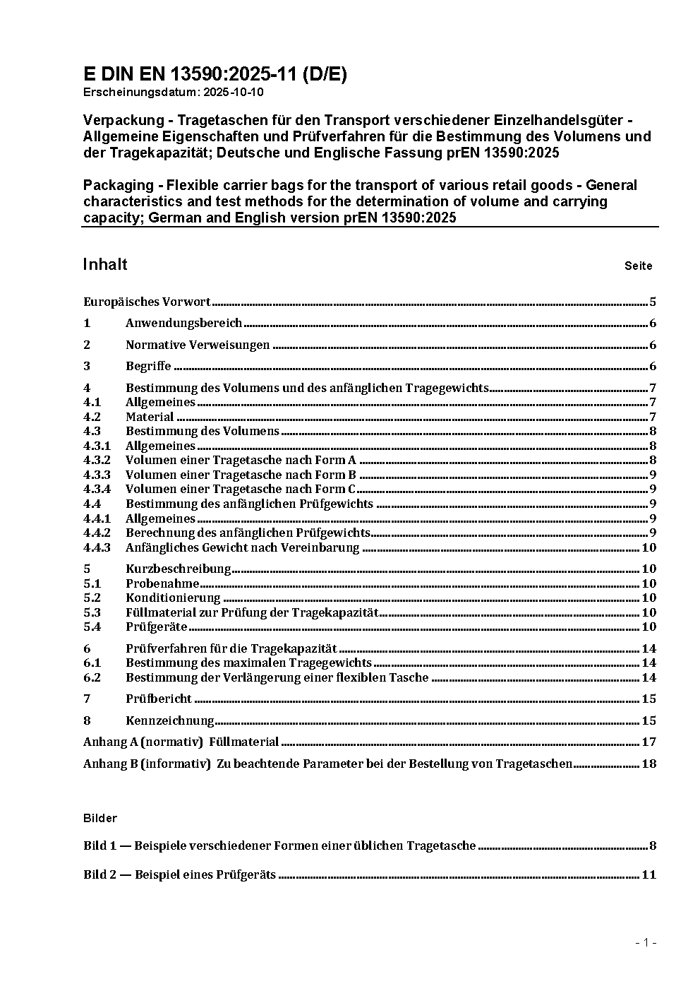 Packaging - Flexible carrier bags for the transport of various retail goods - General characteristics and test methods for the determination of volume and carrying capacity; German version EN 13590:2003