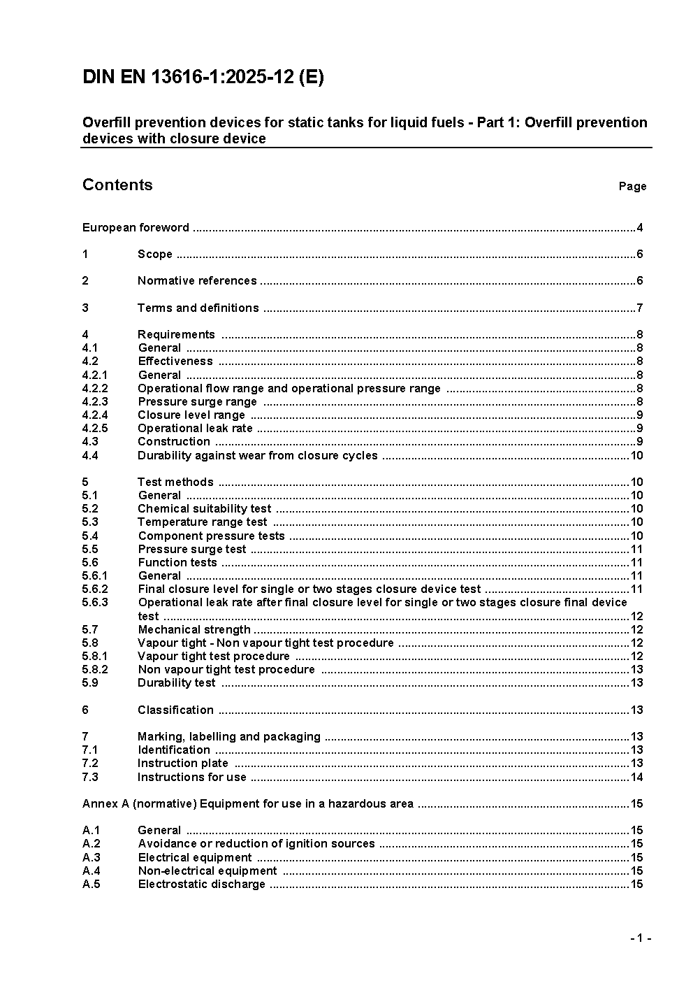Überfüllsicherungen für ortsfeste Tanks für flüssige Brenn- und Kraftstoffe - Teil 1: Überfüllsicherungen mit Schließeinrichtung; Deutsche Fassung EN 13616-1:2016