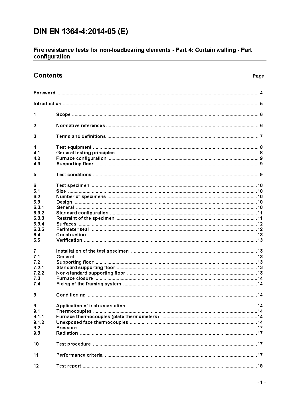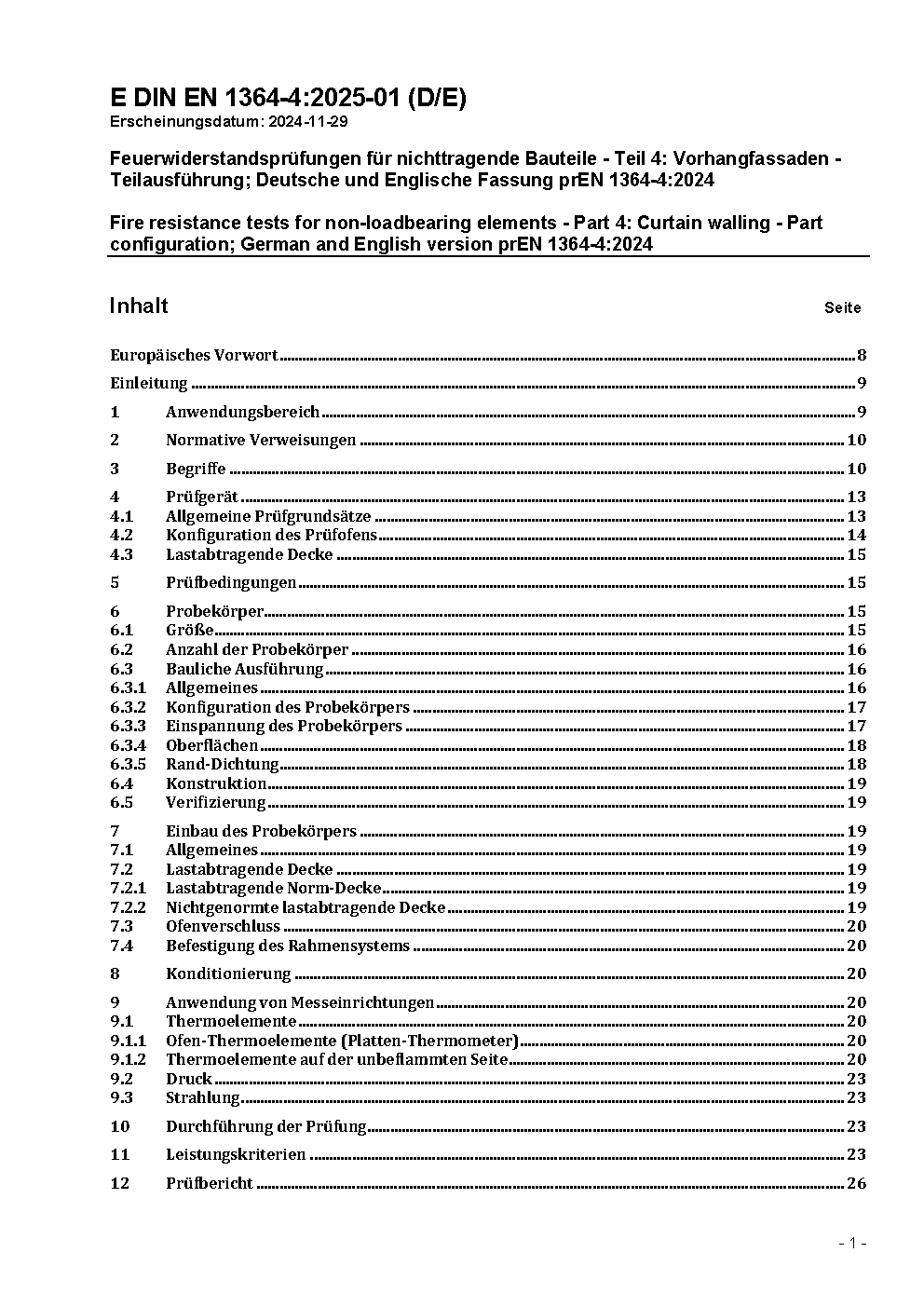 Feuerwiderstandsprüfungen für nichttragende Bauteile - Teil 4: Vorhangfassaden - Teilausführung; Deutsche Fassung prEN 1364-4:2011