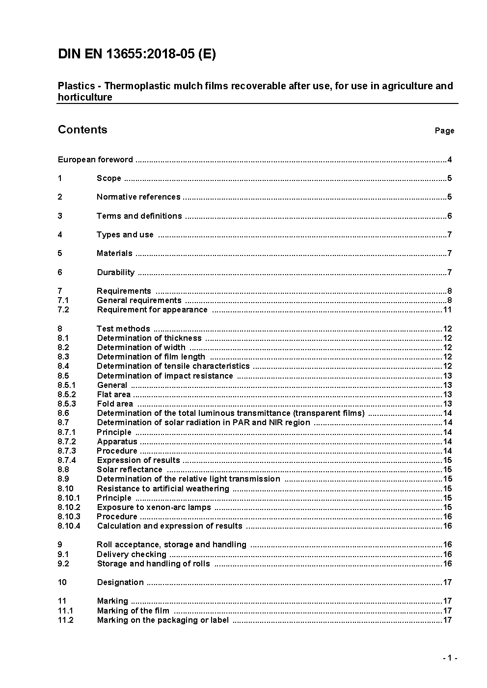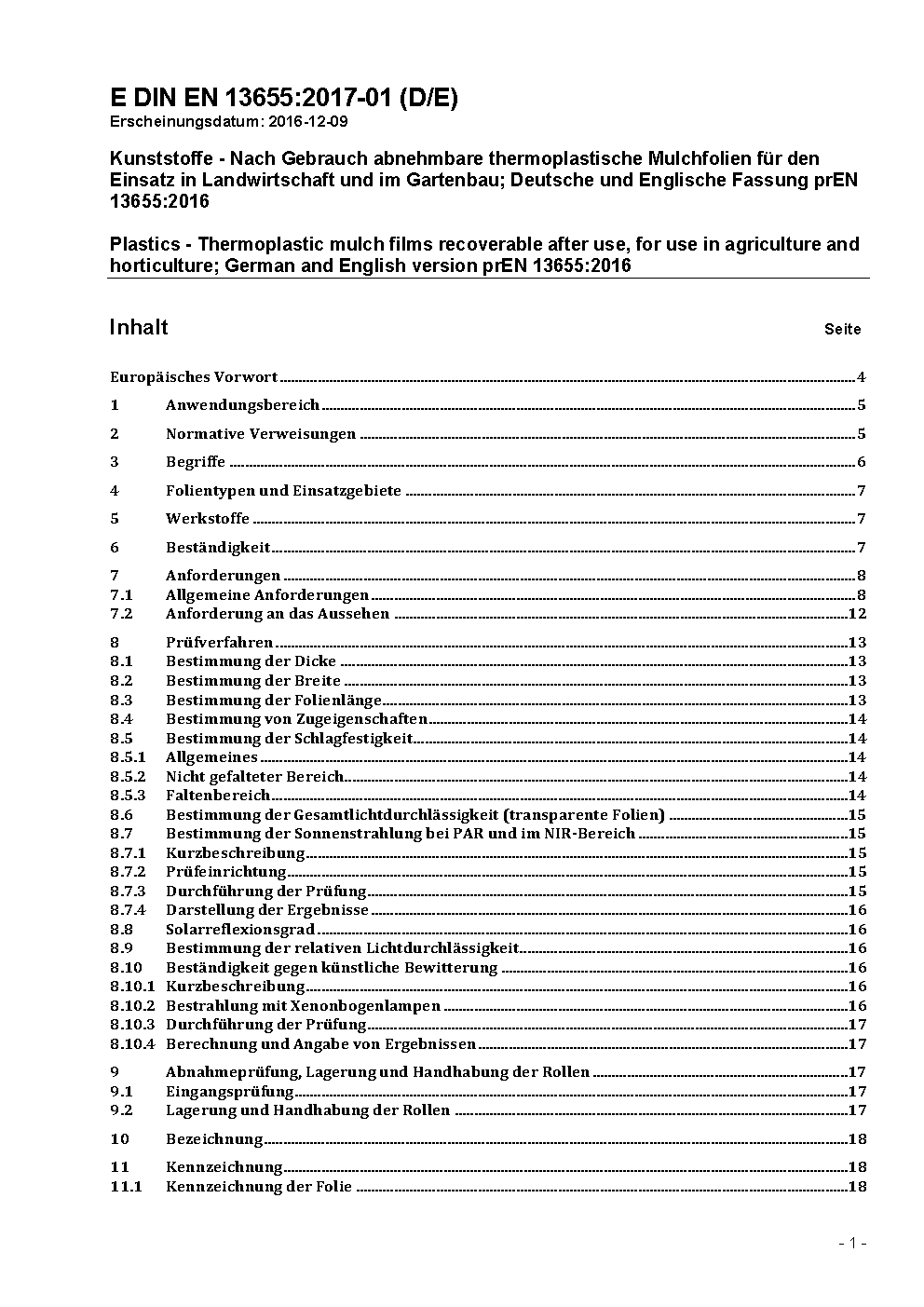 Kunststoffe - Thermoplastische Mulchfolien für den Einsatz in der Landwirtschaft und im Gartenbau; Deutsche Fassung EN 13655:2002