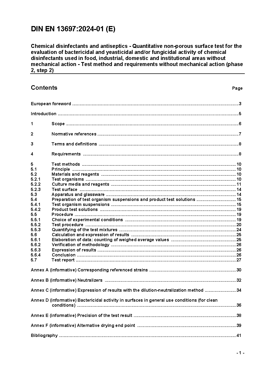 Chemical disinfectants and antiseptics - Quantitative non-porous surface test for the evaluation of bactericidal and/or fungicidal activity of chemical desinfectants used in food, industrial, domestic and institutional areas - Test method and requirements without mechanical action (phase 2/step 2); German version EN 13697:2001
