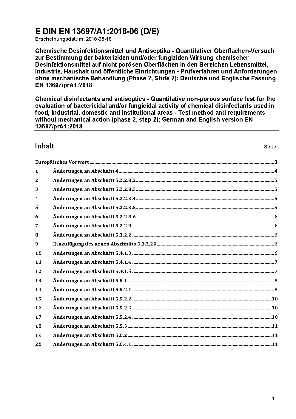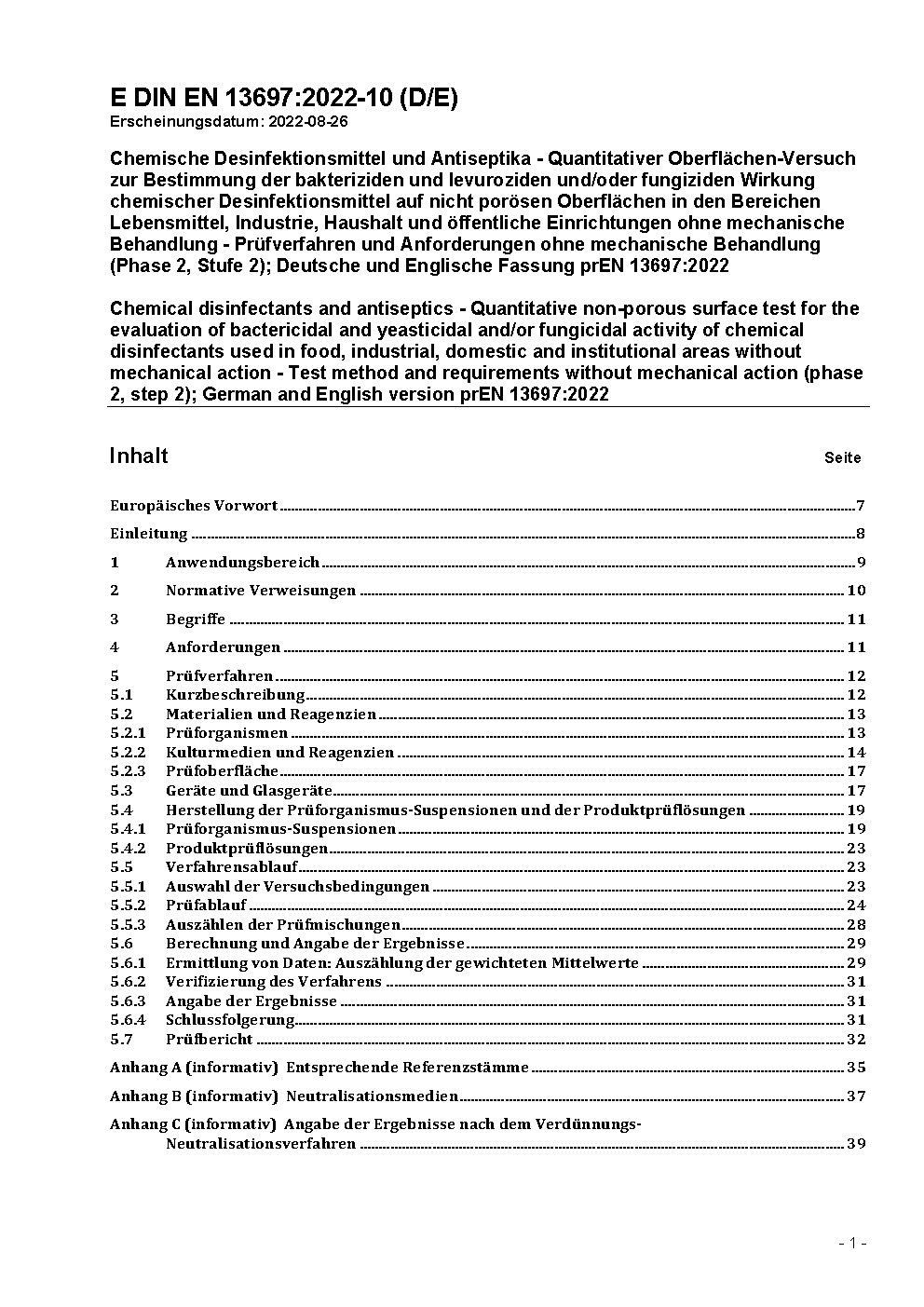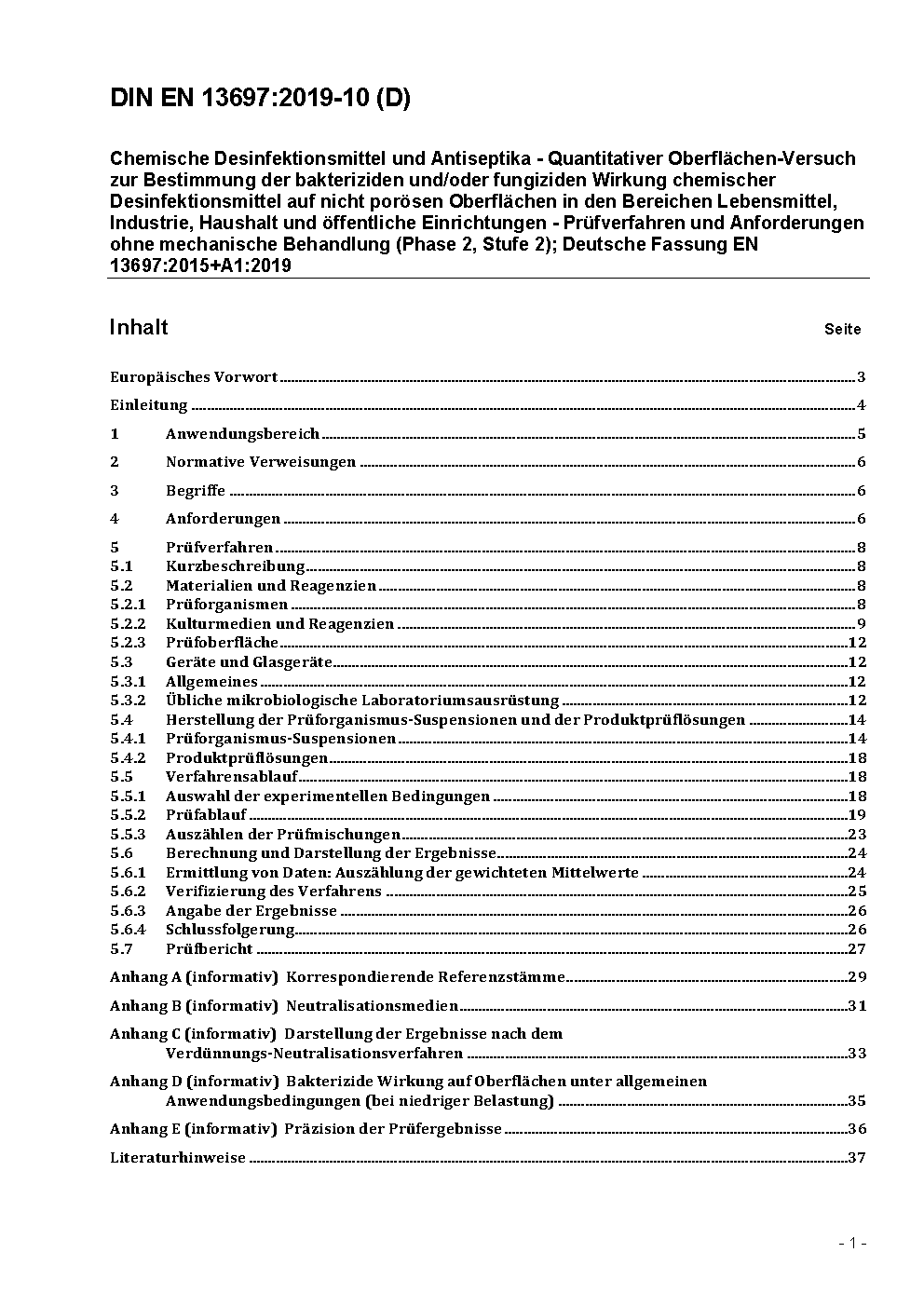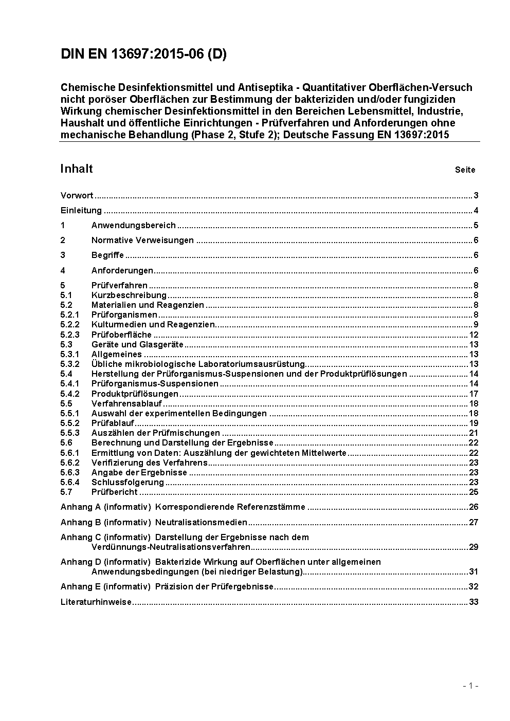 Chemische Desinfektionsmittel und Antiseptika - Quantitativer Oberflächen-Versuch nicht poröser Oberflächen zur Bestimmung der bakteriziden und/oder fungiziden Wirkung chemischer Desinfektionsmittel in den Bereichen Lebensmittel, Industrie, Haushalt und öffentliche Einrichtungen - Prüfverfahren ohne mechanische Behandlung und Anforderungen (Phase 2/Stufe 2); Deutsche Fassung EN 13697:2001