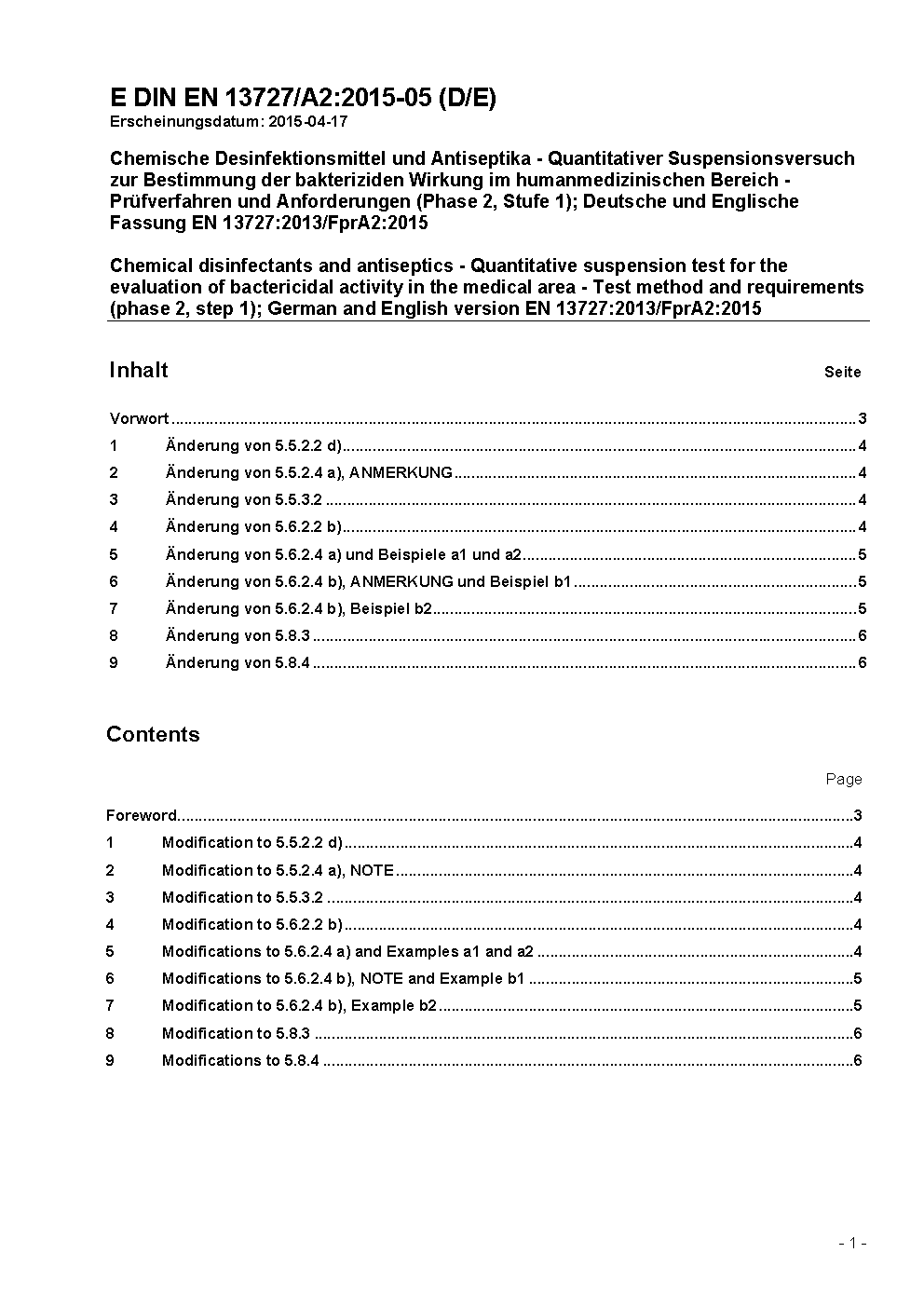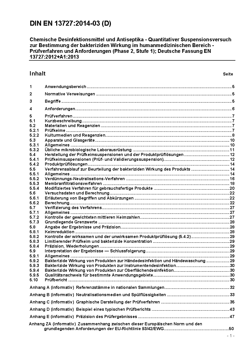 Chemische Desinfektionsmittel und Antiseptika - Quantitativer Suspensionsversuch zur Bestimmung der bakteriziden Wirkung im humanmedizinischen Bereich - Prüfverfahren und Anforderungen (Phase 2, Stufe 1); Deutsche Fassung EN 13727:2012