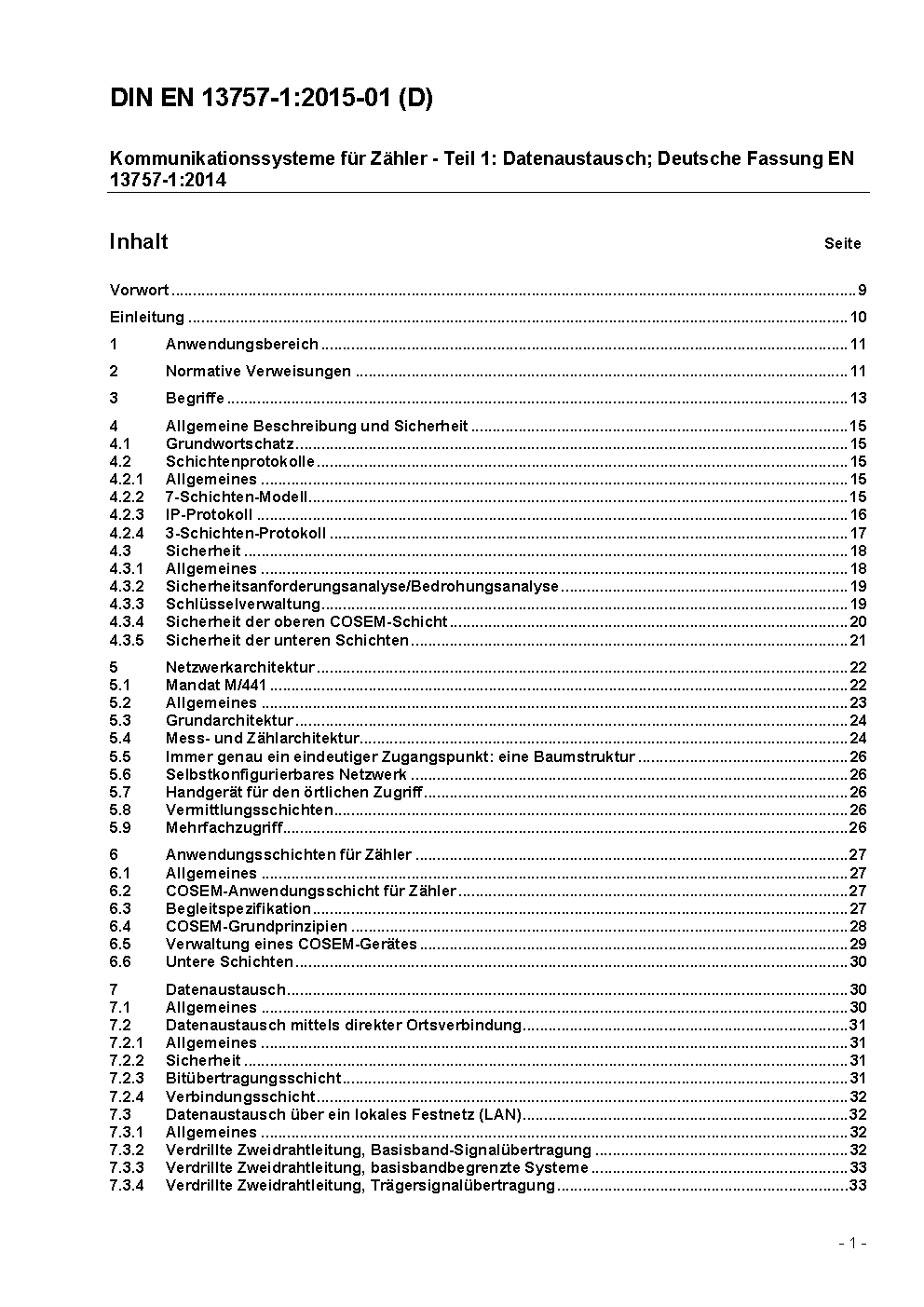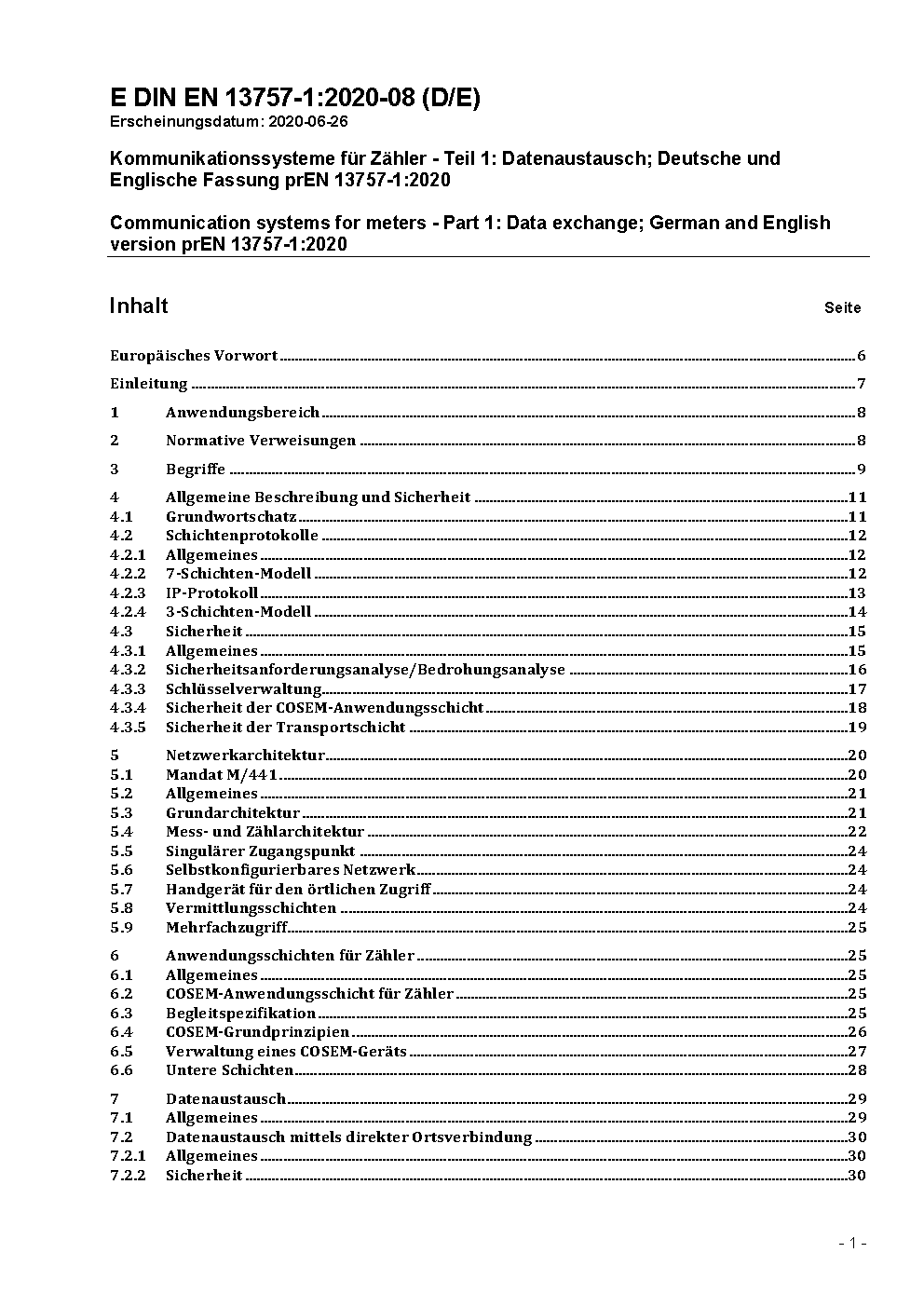 Kommunikationssysteme für Zähler - Teil 1: Datenaustausch; Deutsche und Englische Fassung prEN 13757-1:2020