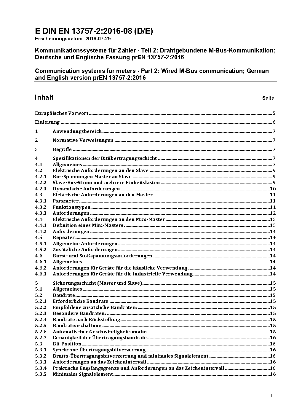 Kommunikationssysteme für Zähler und deren Fernablesung - Teil 2: Physikalische Schicht und Verbindungsschicht, paarig, verdrillte Leitungen (M-Bus); Englische Fassung prEN 13757-2:2002