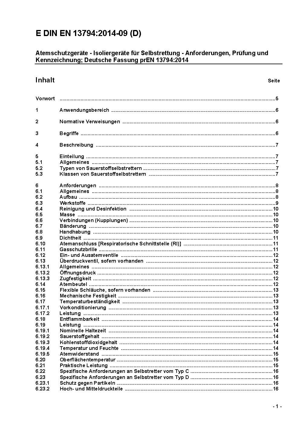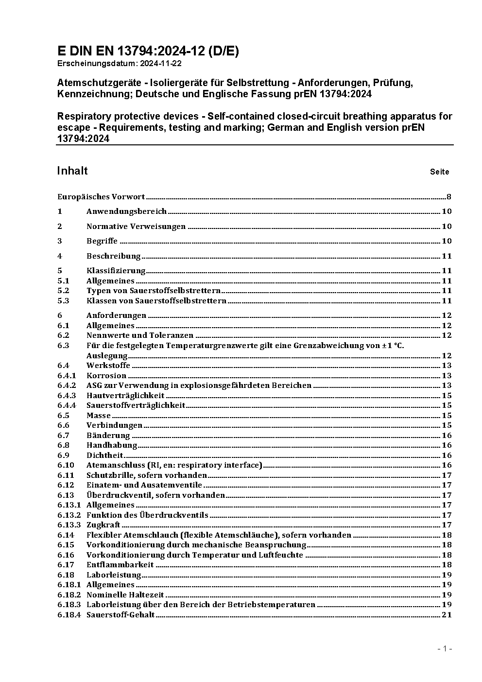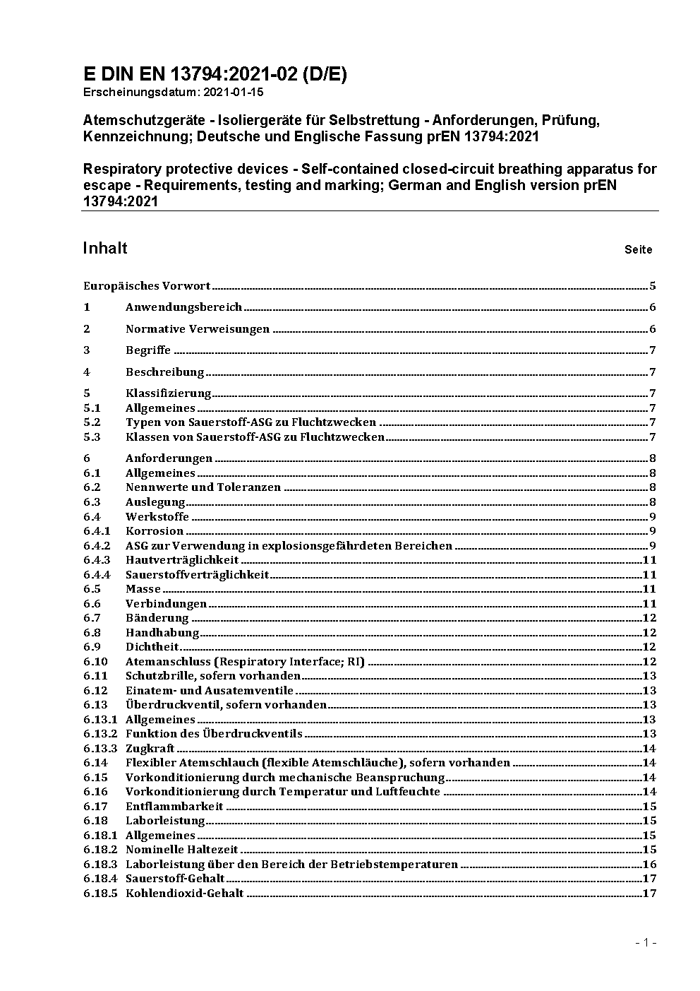 Atemschutzgeräte - Isoliergeräte für Selbstrettung - Anforderungen, Prüfung, Kennzeichnung; Deutsche Fassung EN 13794:2002