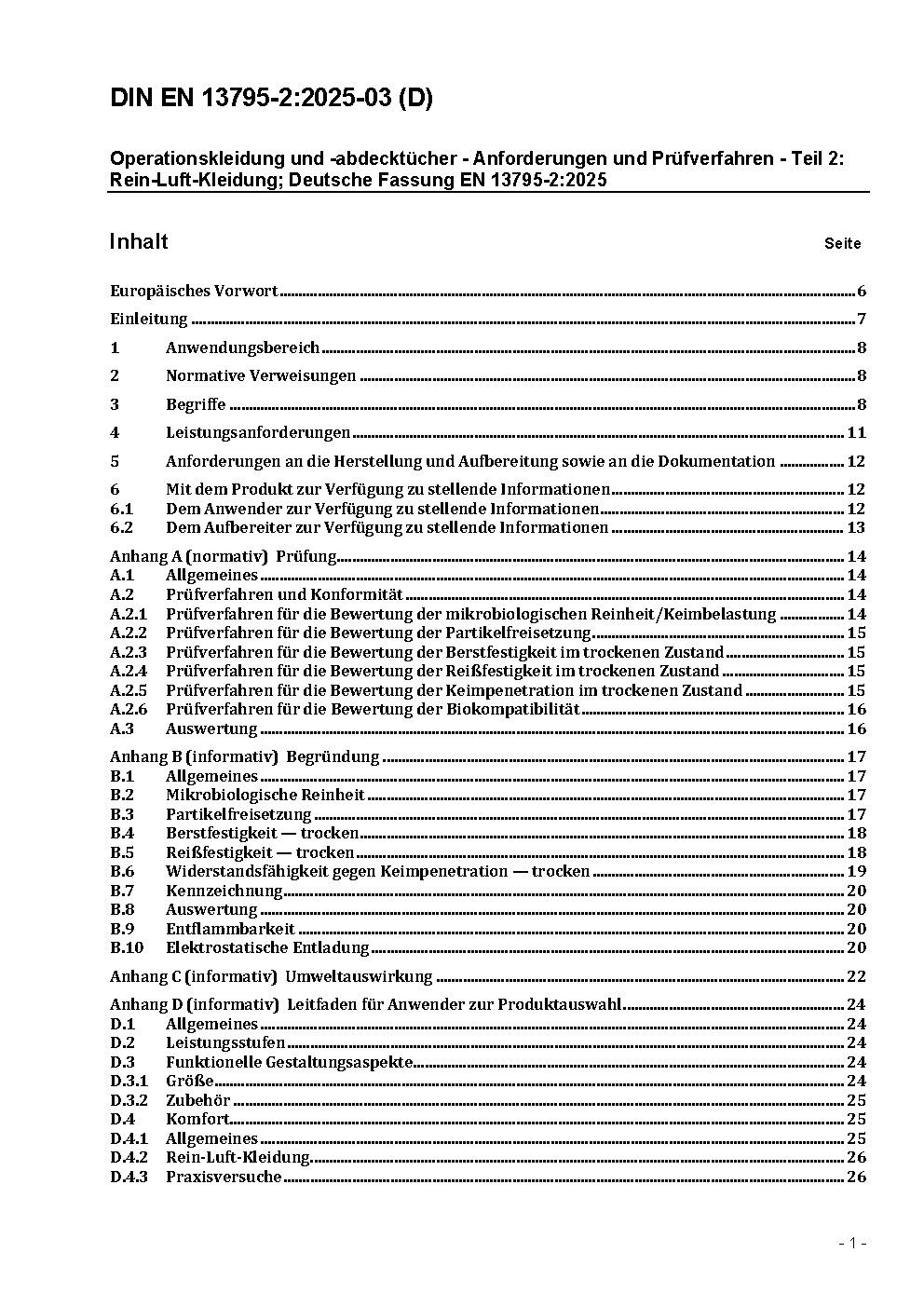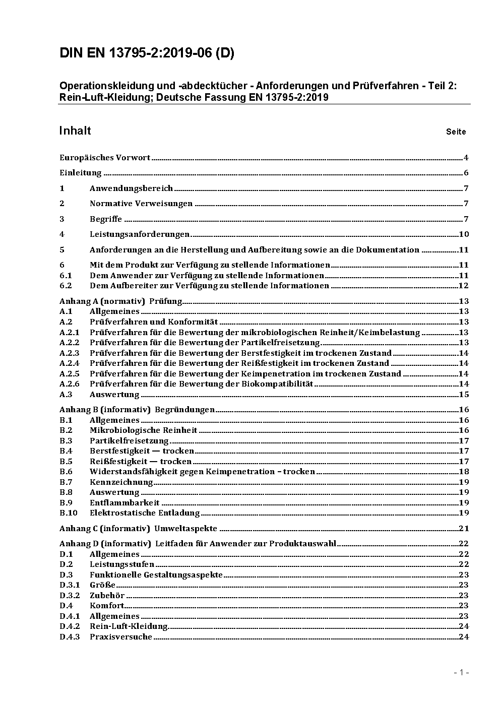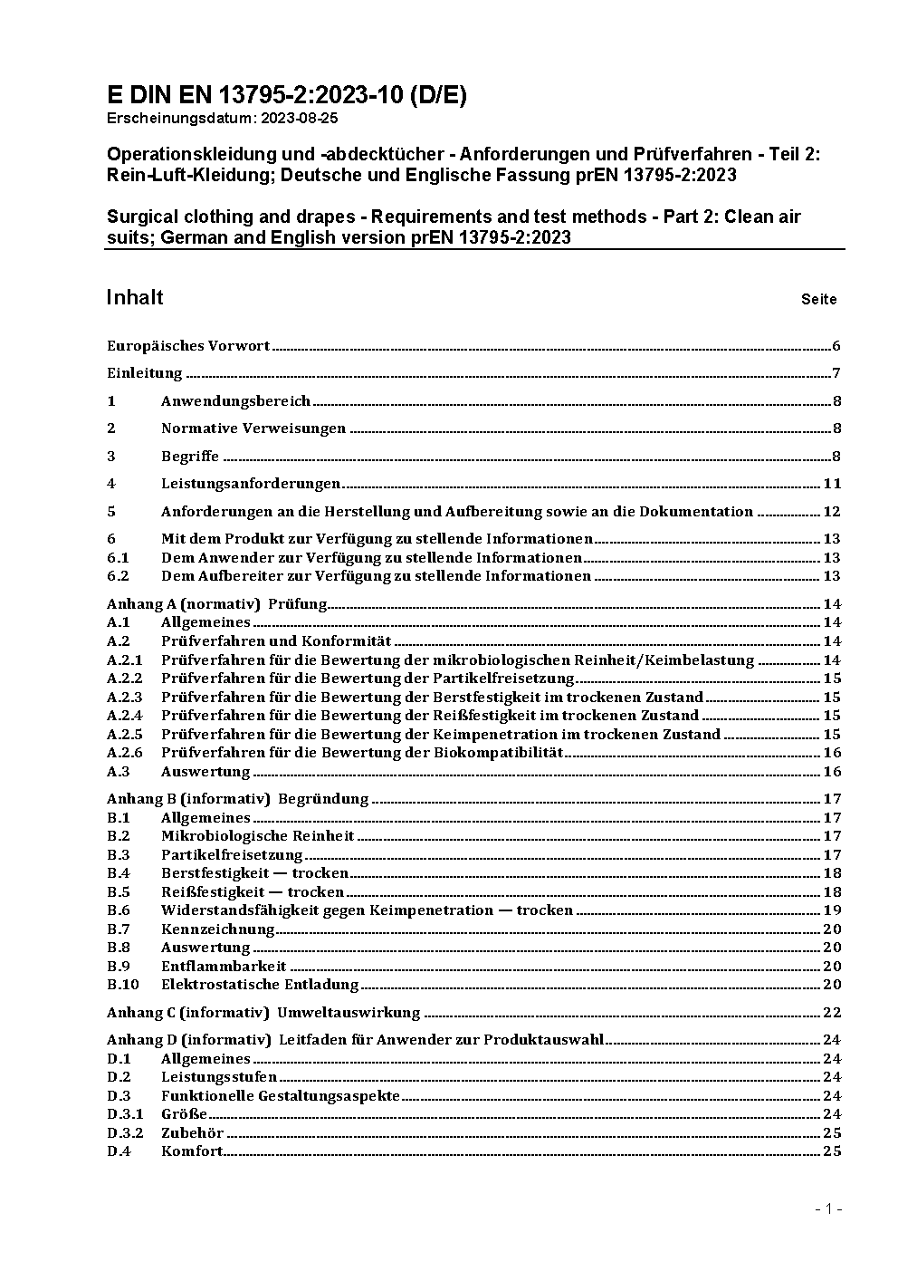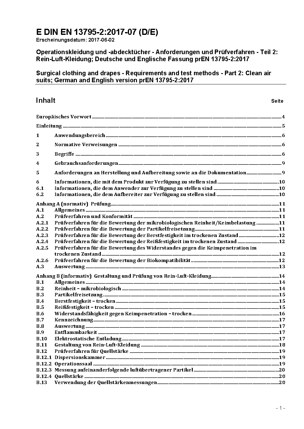Surgical drapes, gowns and clean air suits, used as medical devices for patients, clinical staff and equipment - Part 2: Test methods; German version EN 13795-2:2004.