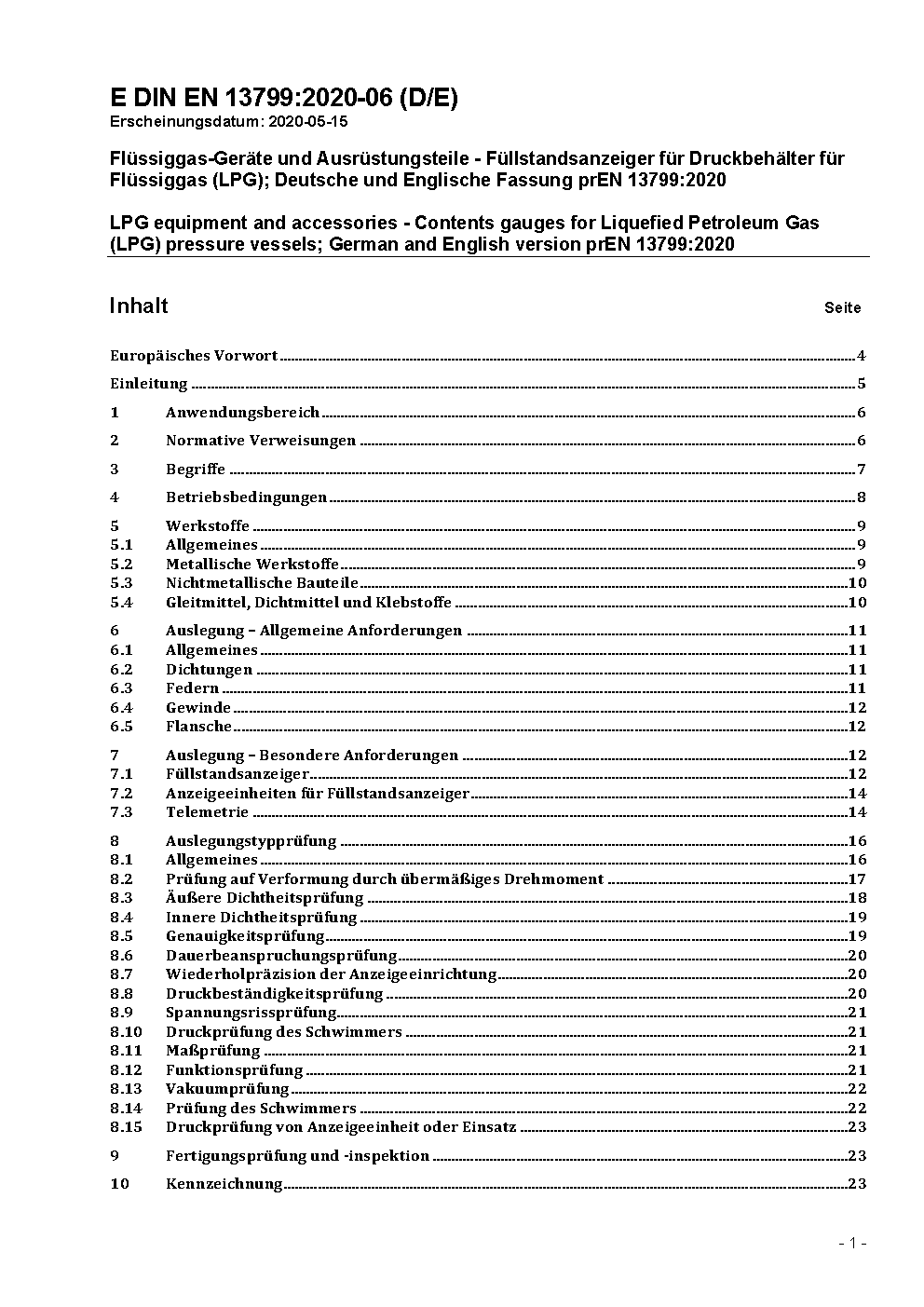 Flüssiggas-Geräte und -Ausrüstungsteile - Füllstandsanzeiger für Flüssiggasbehälter (LPG); Deutsche Fassung prEN 13799:2009