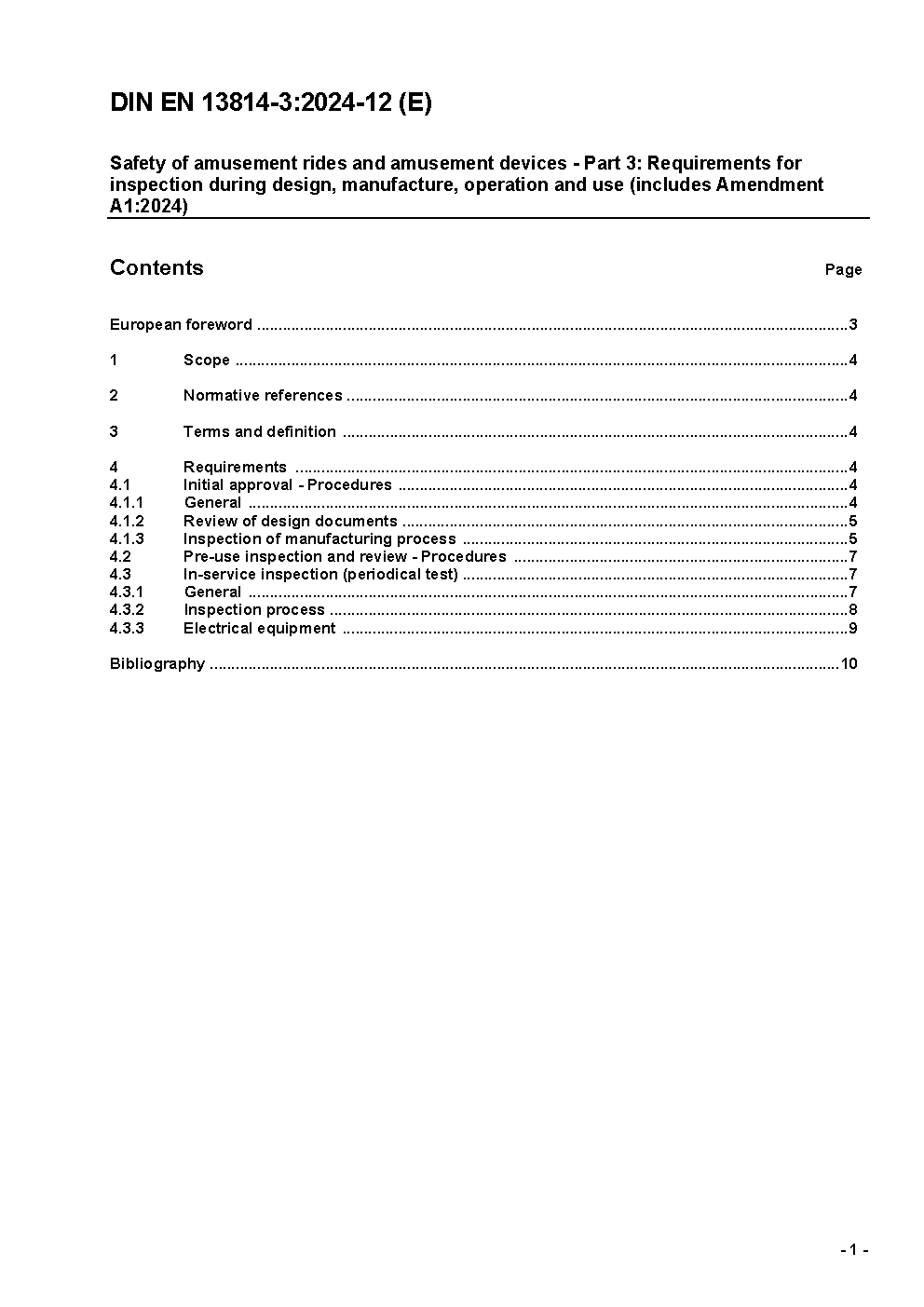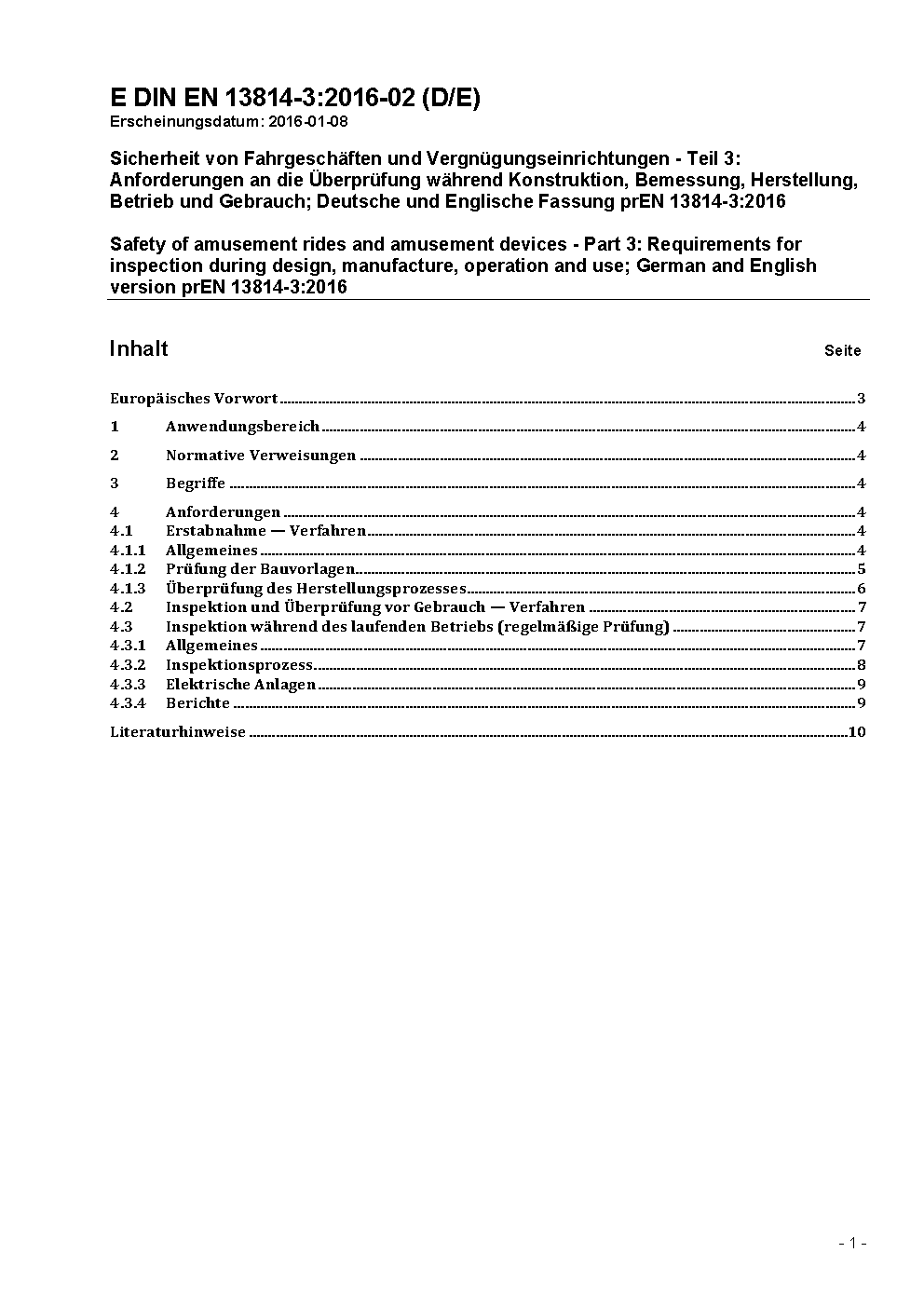 Safety of amusement rides and amusement devices - Part 3: Requirements for inspection during design, manufacture, operation and use; German and English version EN 13814-3:2019/prA1:2023