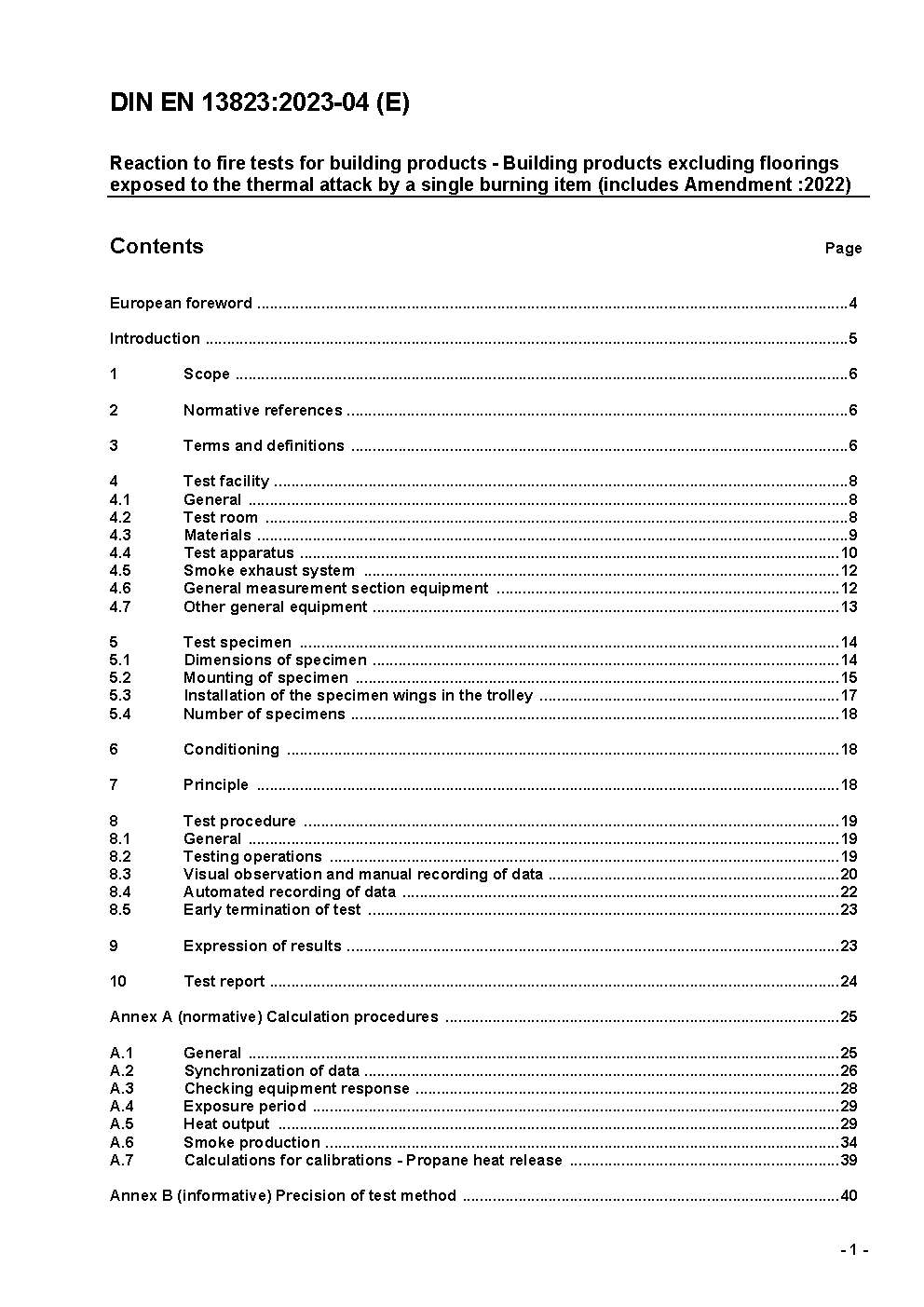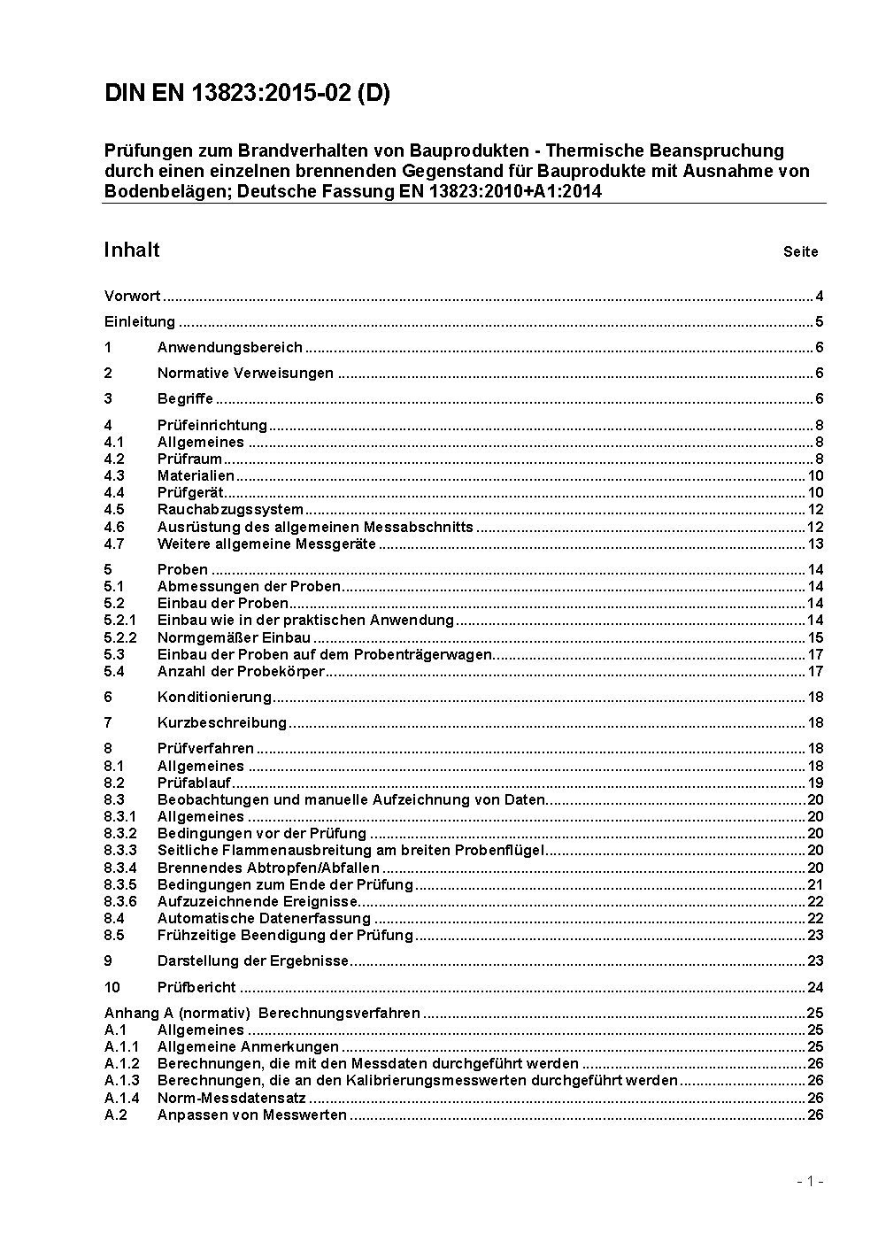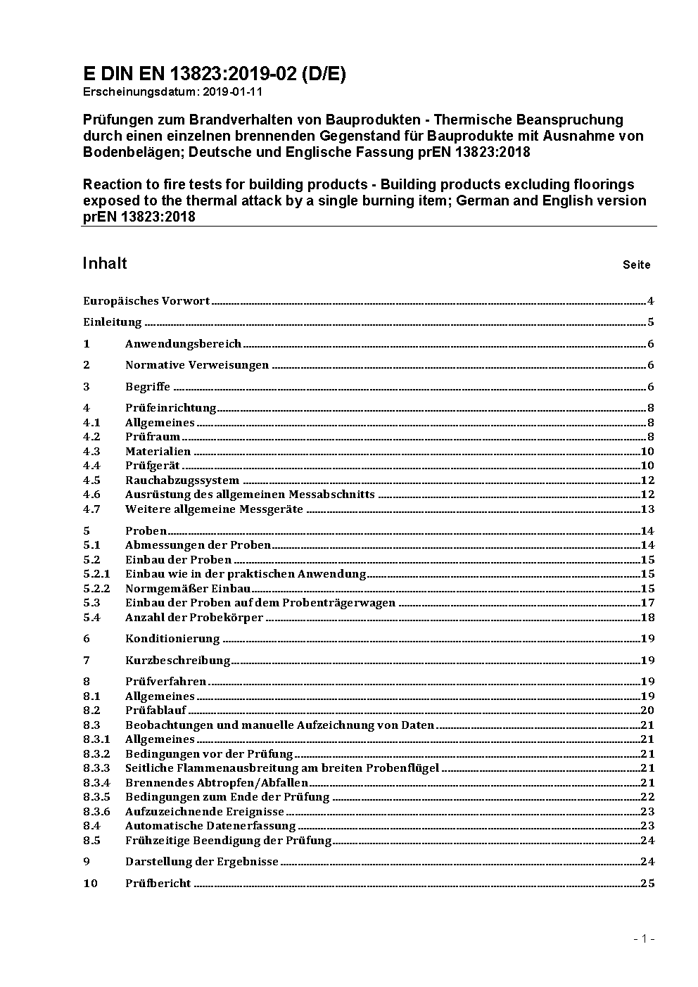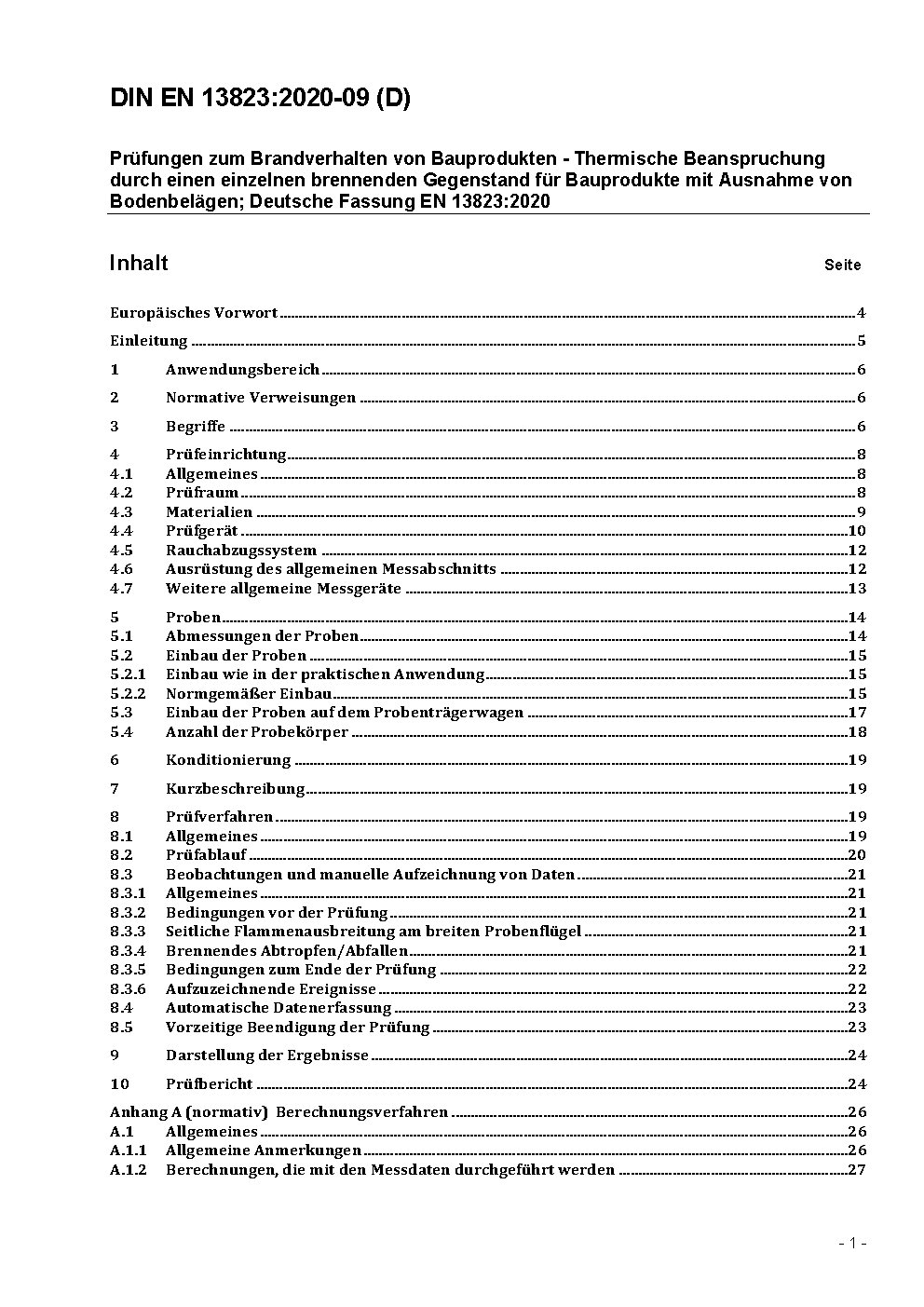 Prüfungen zum Brandverhalten von Bauprodukten - Thermische Beanspruchung durch einen einzelnen brennenden Gegenstand für Bauprodukte mit Ausnahme von Bodenbelägen; Deutsche Fassung EN 13823:2010 / Achtung: Übergangsfrist, festgelegt durch DIN EN 13823 (2015-02), bis 2016-08-31 beachten.