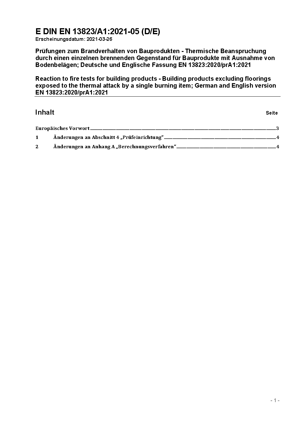 Reaction to fire tests for building products - Building products excluding floorings exposed to the thermal attack by a single burning item; German version EN 13823:2010.