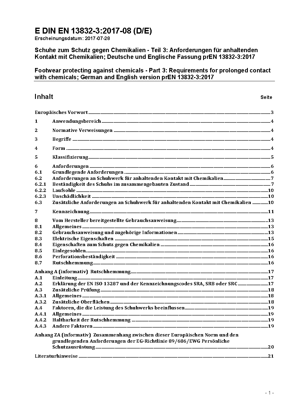 Schuhe zum Schutz gegen Chemikalien - Teil 3: Anforderungen für anhaltenden Kontakt mit Chemikalien; Deutsche Fassung EN 13832-3:2018