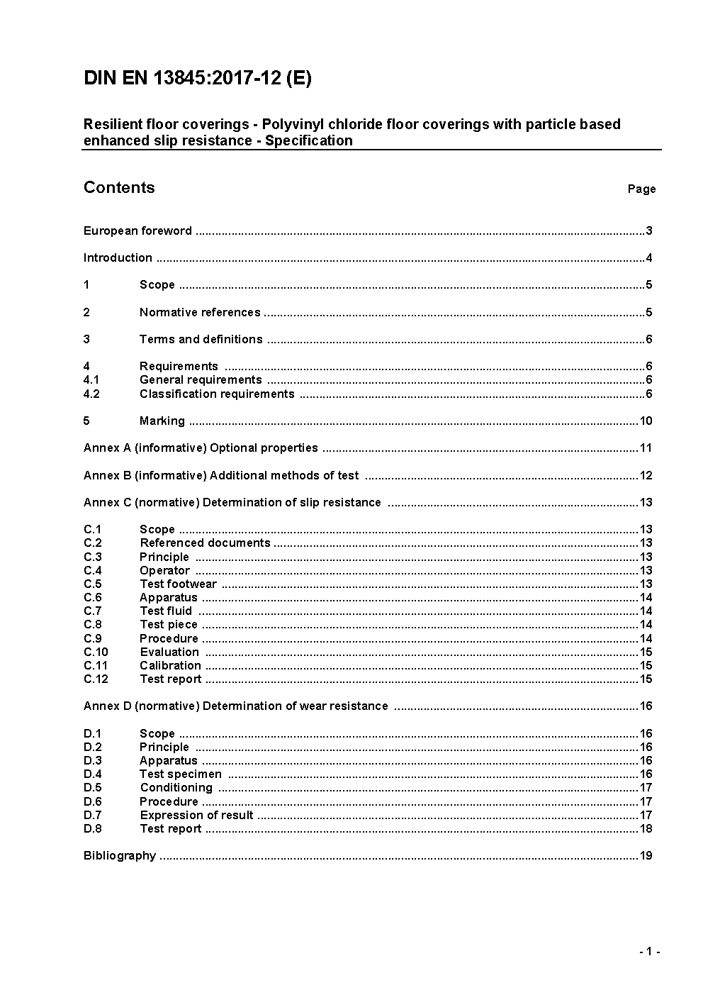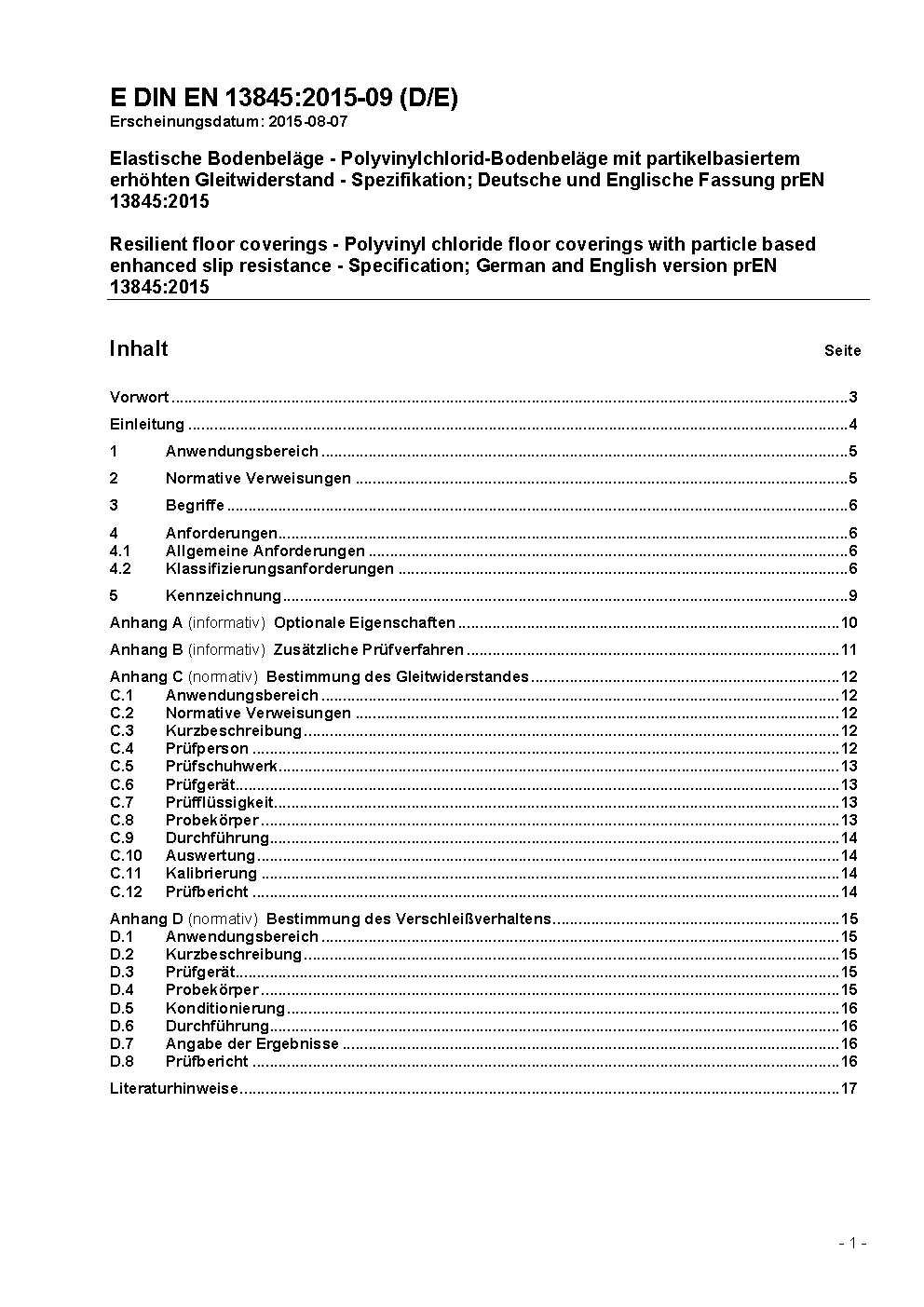 Elastische Bodenbeläge - Polyvinylchlorid-Bodenbeläge mit partikelbasiertem erhöhten Gleitwiderstand - Spezifikation; Deutsche Fassung EN 13845:2005