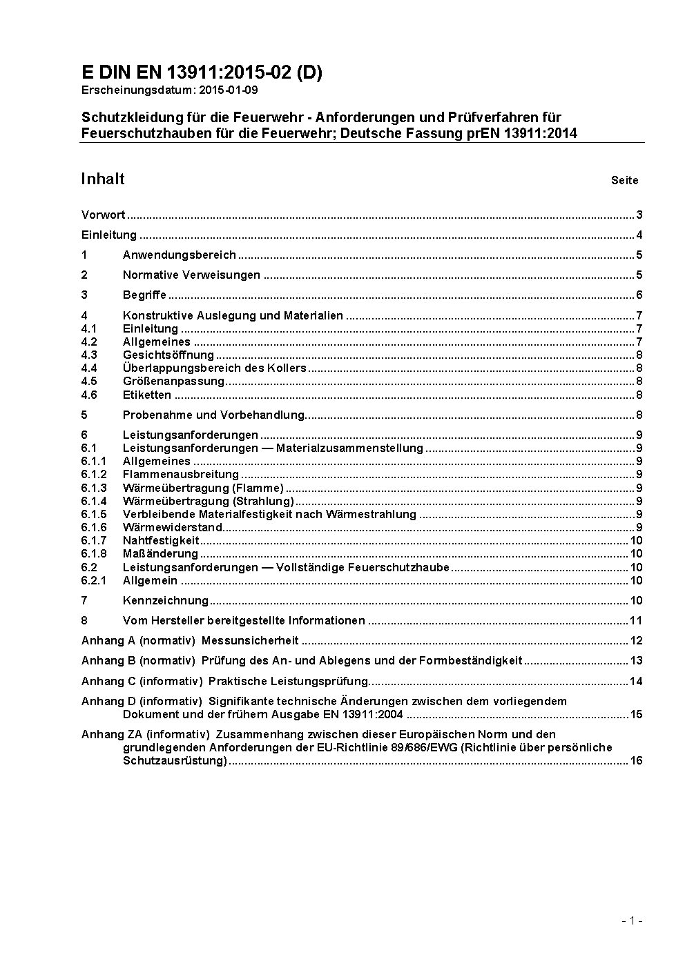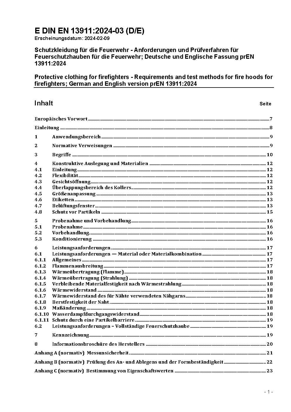 Schutzkleidung für die Feuerwehr - Anforderungen und Prüfverfahren für Feuerschutzhauben für die Feuerwehr - Deutsche Fassung EN 13911:2004