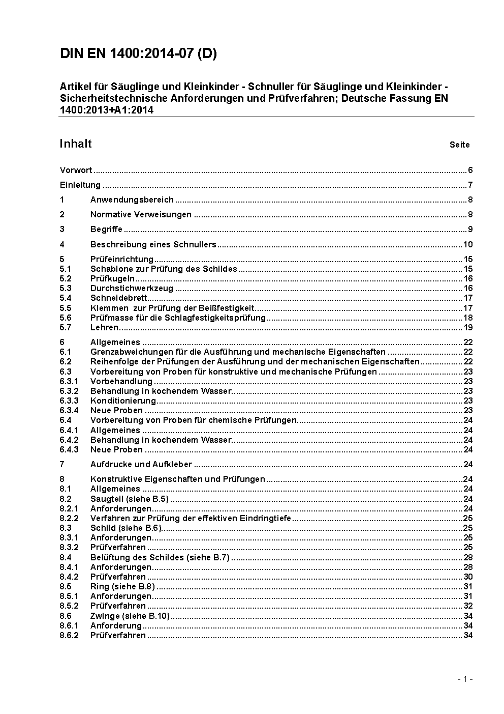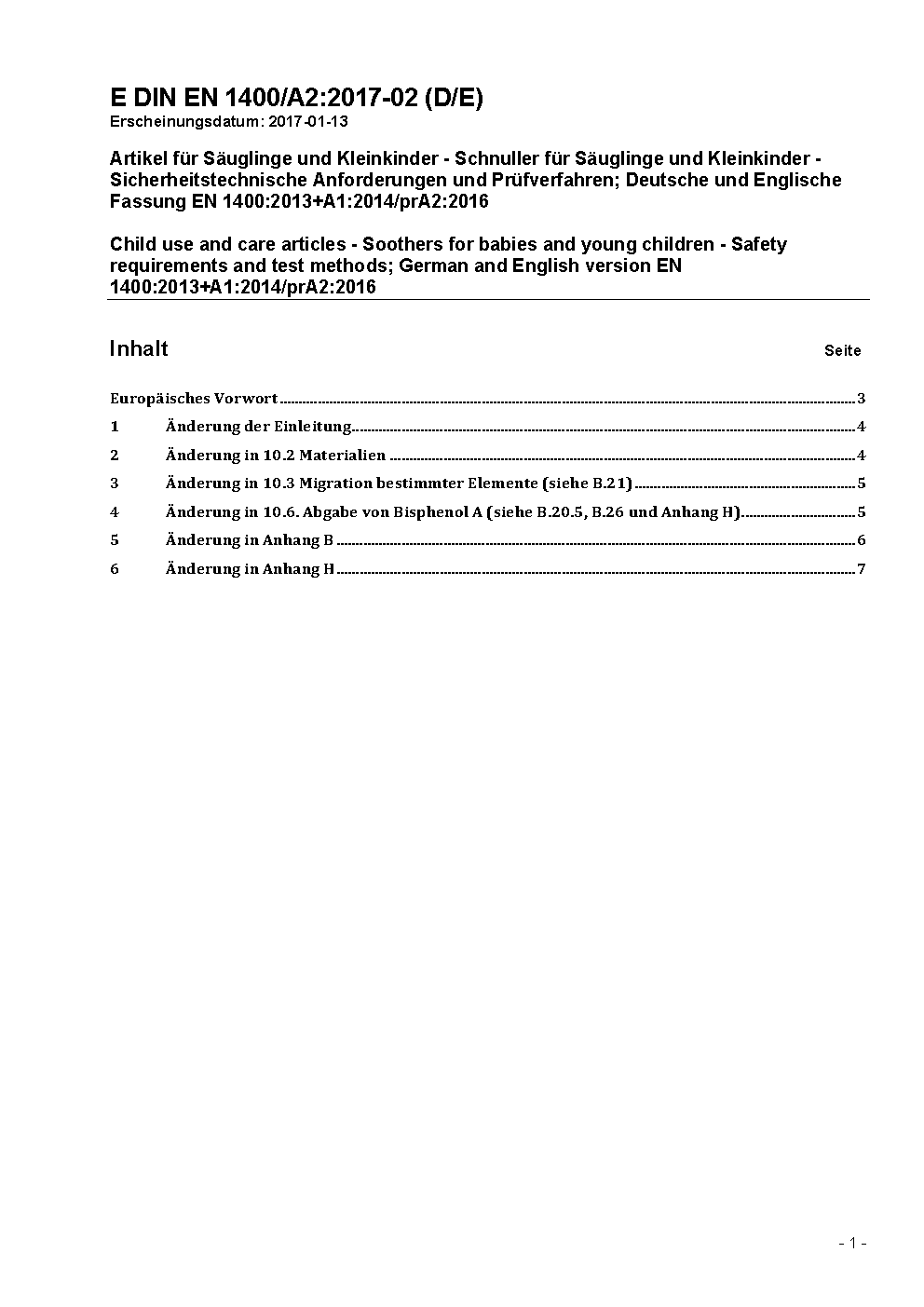 Artikel für Säuglinge und Kleinkinder - Schnuller für Säuglinge und Kleinkinder - Sicherheitstechnische Anforderungen und Prüfverfahren; Deutsche und Englische Fassung EN 1400:2013+A1:2014/prA2:2016
