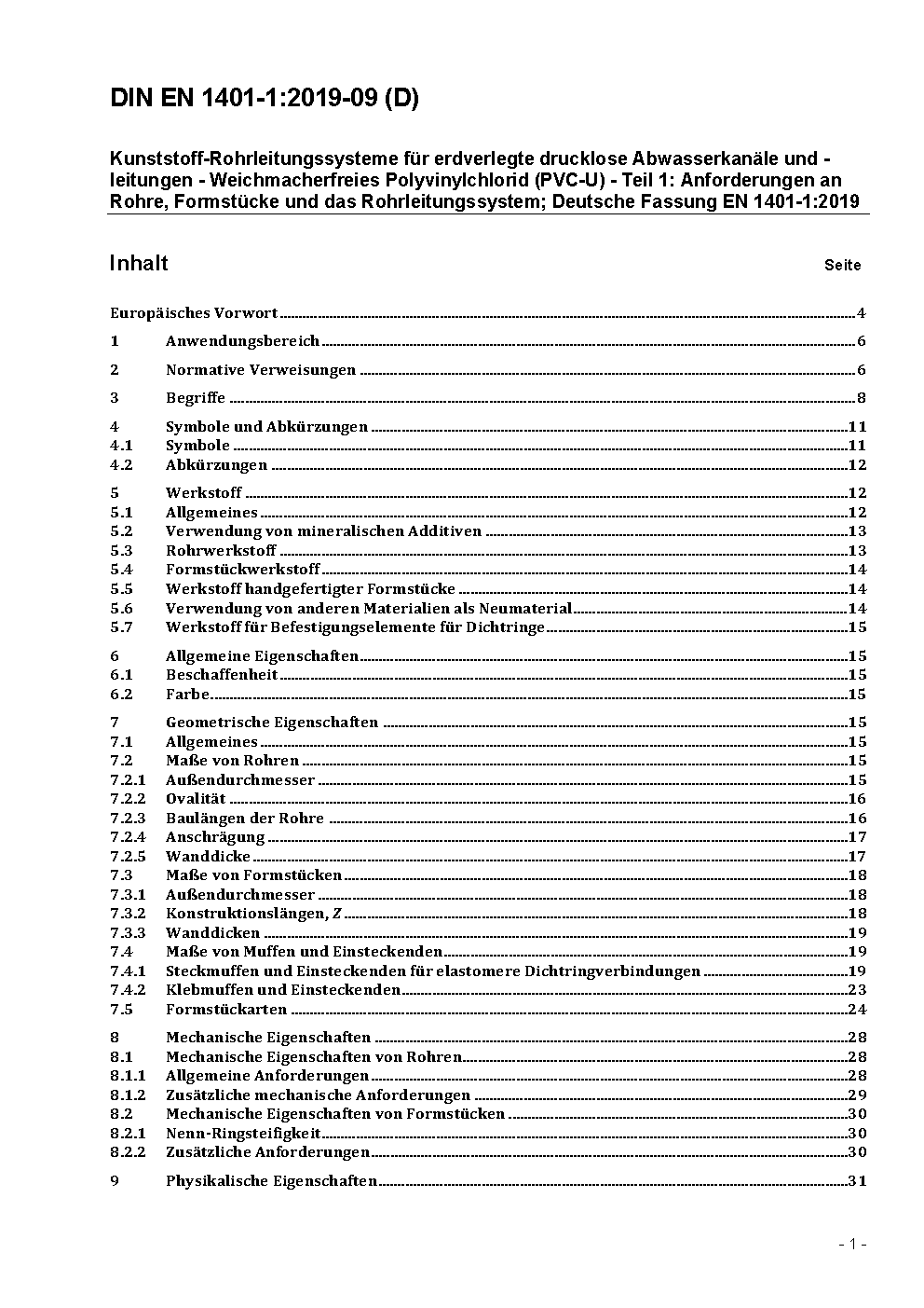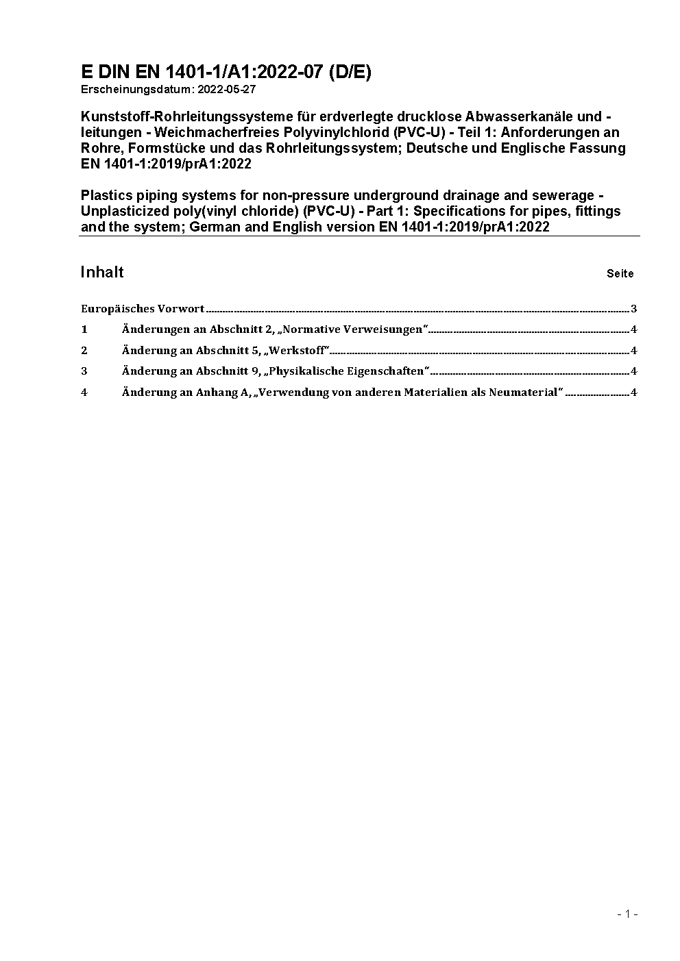 Kunststoff-Rohrleitungssysteme für erdverlegte drucklose Abwasserkanäle und -leitungen; Weichmacherfreies Polyvinylchlorid (PVC-U); Teil 1: Allgemeines; Deutsche Fassung prEN 1401-1:1994
