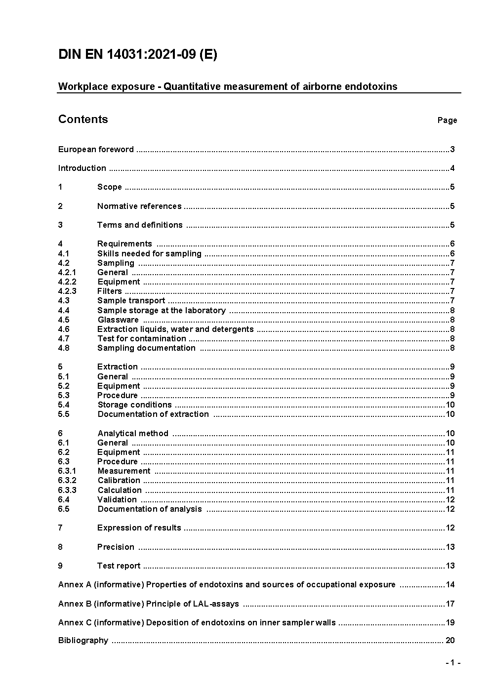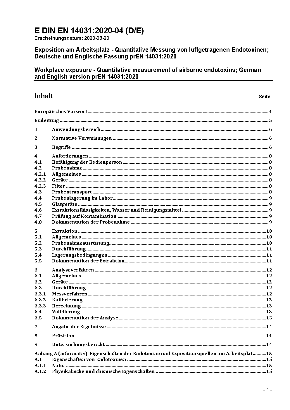 Arbeitsplatzatmosphäre - Bestimmung von luftgetragenen Endotoxinen; Deutsche Fassung EN 14031:2003