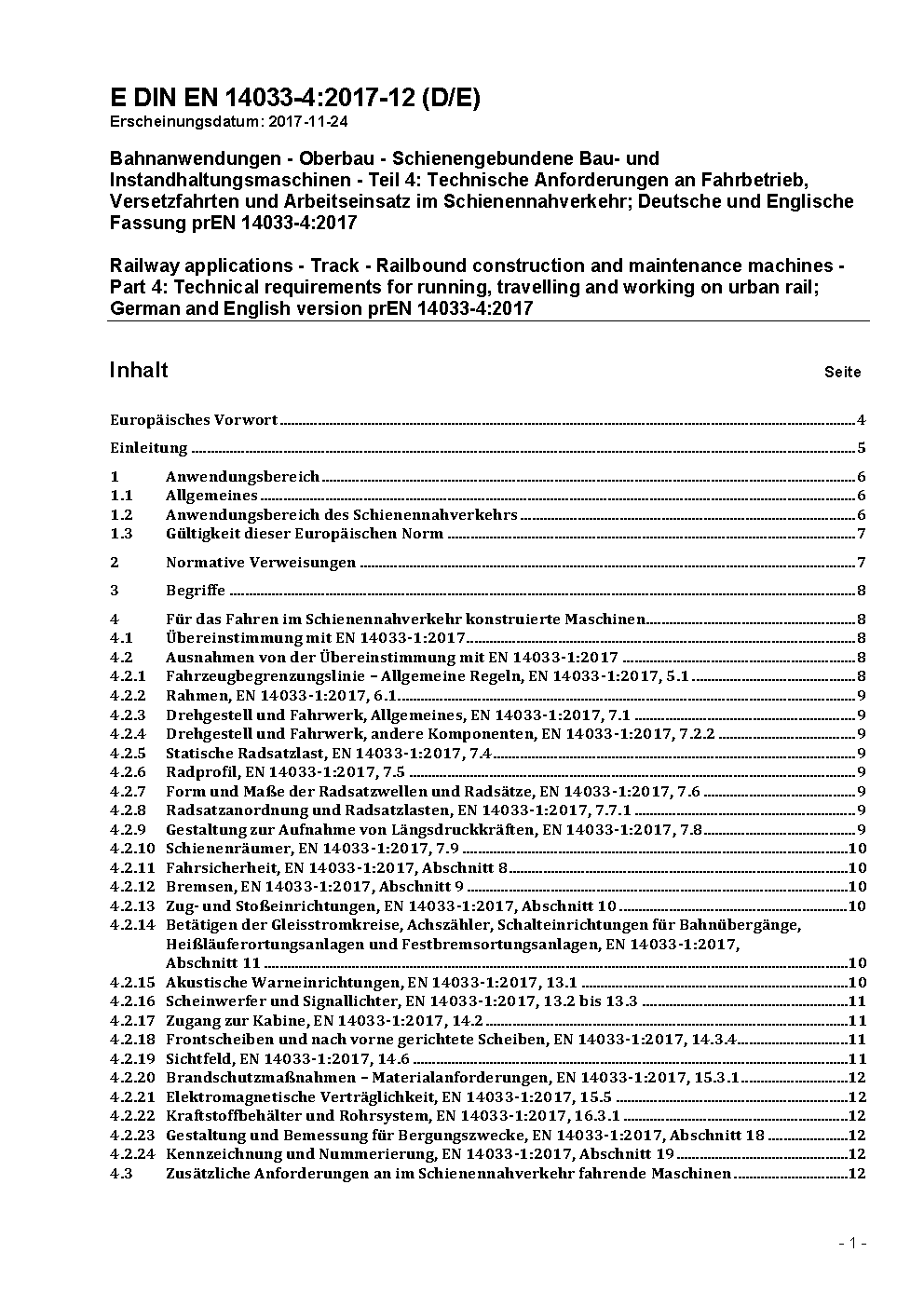 Bahnanwendungen - Oberbau - Schienengebundene Bau- und Instandhaltungsmaschinen - Teil 4: Technische Anforderungen an Fahrbetrieb, Versetzfahrten und Arbeitseinsatz im Schienennahverkehr; Deutsche und Englische Fassung prEN 14033-4:2017