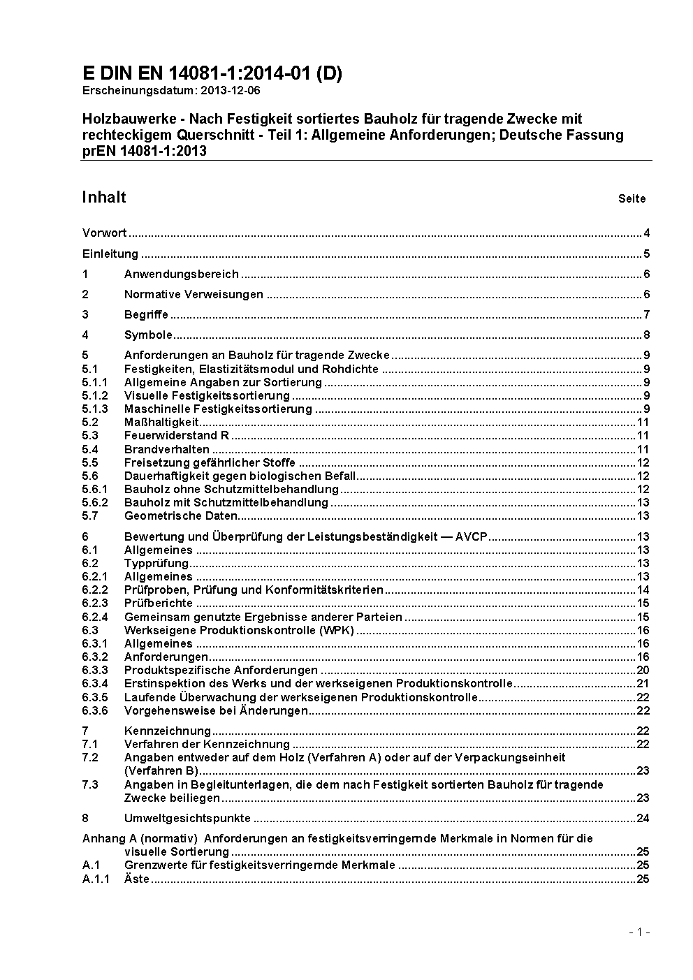 Holzbauwerke - Nach Festigkeit sortiertes Bauholz für tragende Zwecke mit rechteckigem Querschnitt - Teil 1: Allgemeine Anforderungen; Deutsche Fassung prEN 14081-1:2013
