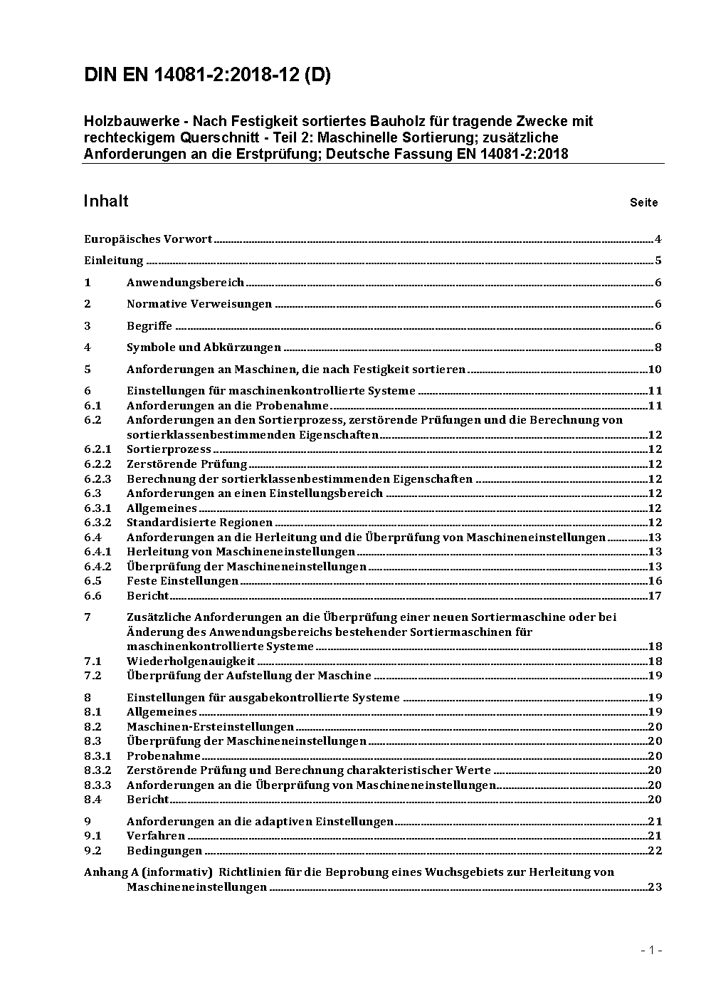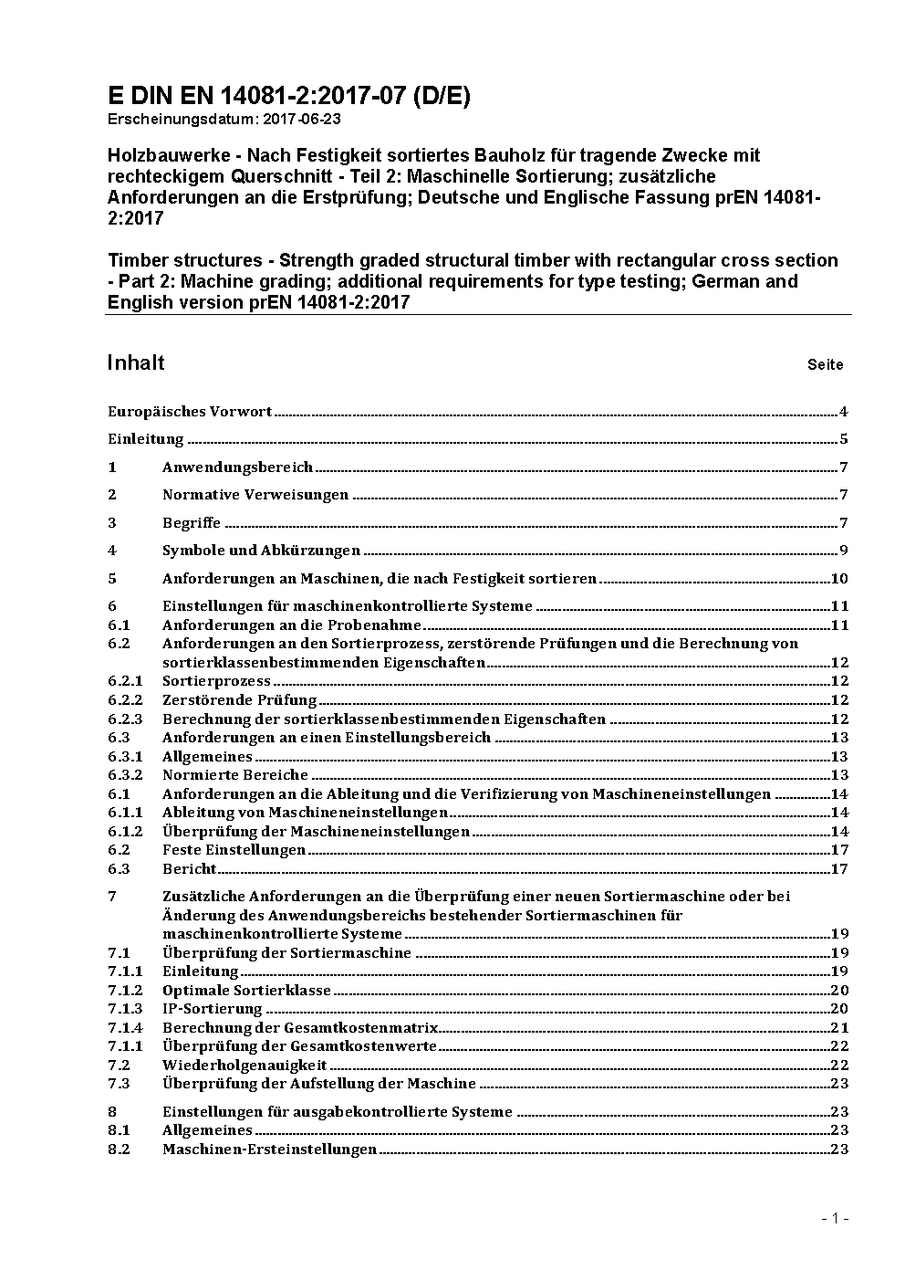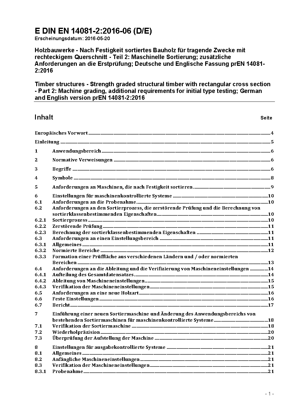 Holzbauwerke - Nach Festigkeit sortiertes Bauholz für tragende Zwecke mit rechteckigem Querschnitt - Teil 2: Maschinelle Sortierung; zusätzliche Anforderungen an die Erstprüfung; Deutsche und Englische Fassung prEN 14081-2:2016