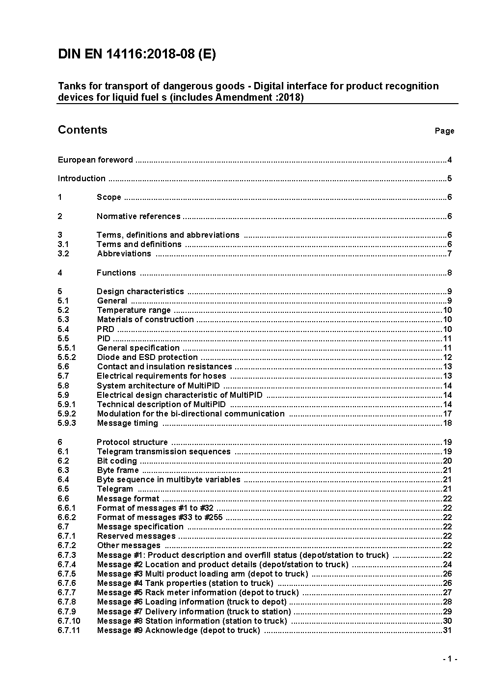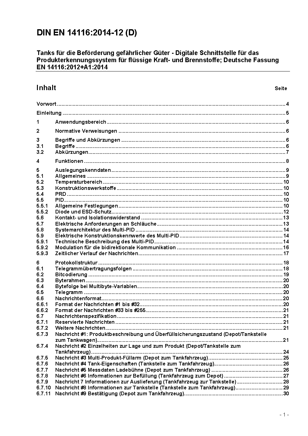 Tanks für die Beförderung gefährlicher Güter - Digitale Schnittstelle für das Produkterkennungssystem für flüssige Kraft- und Brennstoffe; Deutsche Fassung EN 14116:2012+A2:2018