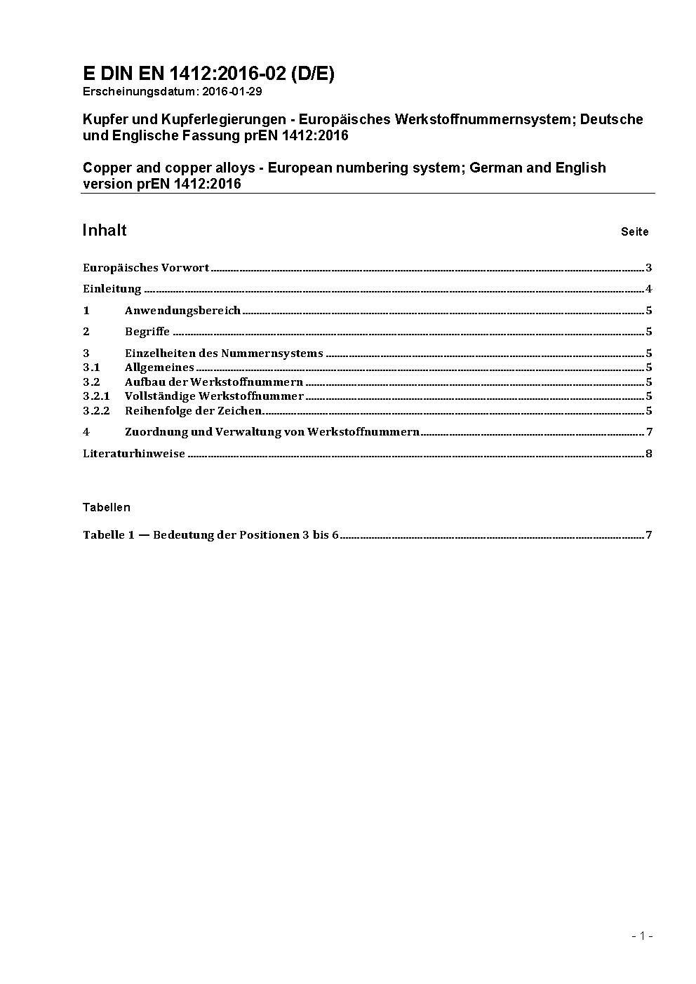 Copper and copper alloys - European numbering system; German version EN 1412:2016
