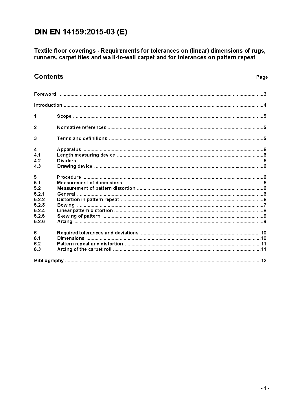 Textile floor coverings - Requirements for tolerances on (linear) dimensions of rugs, runners, carpet tiles and wall-to-wall carpet and for tolerances on pattern repeat; English version FprEN 14159:2014