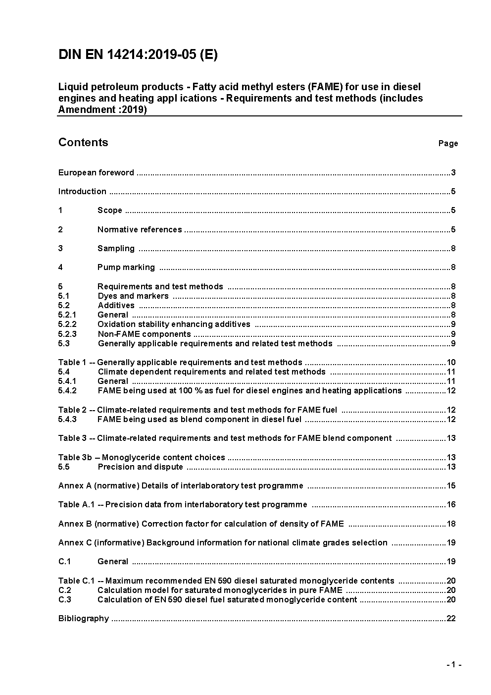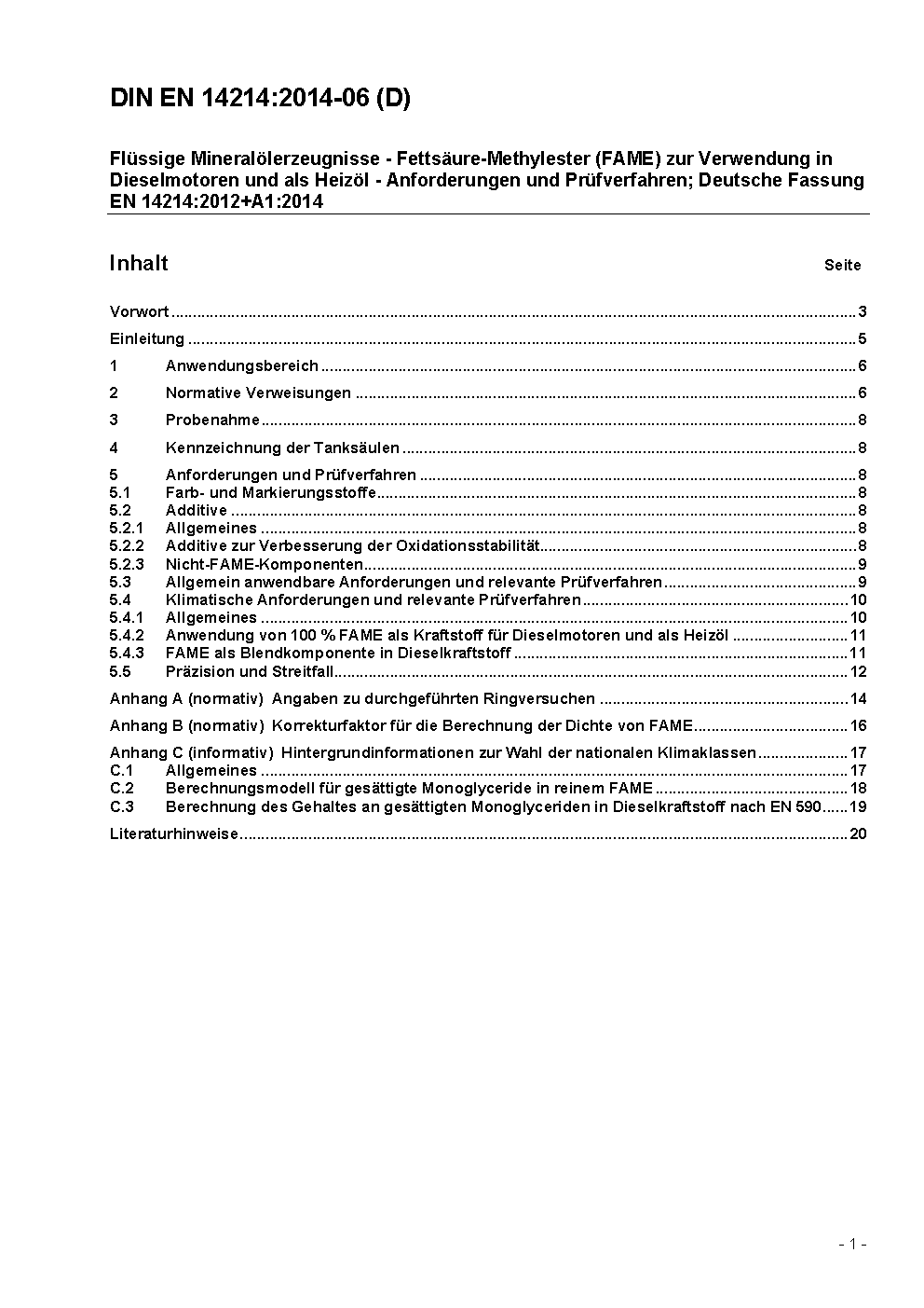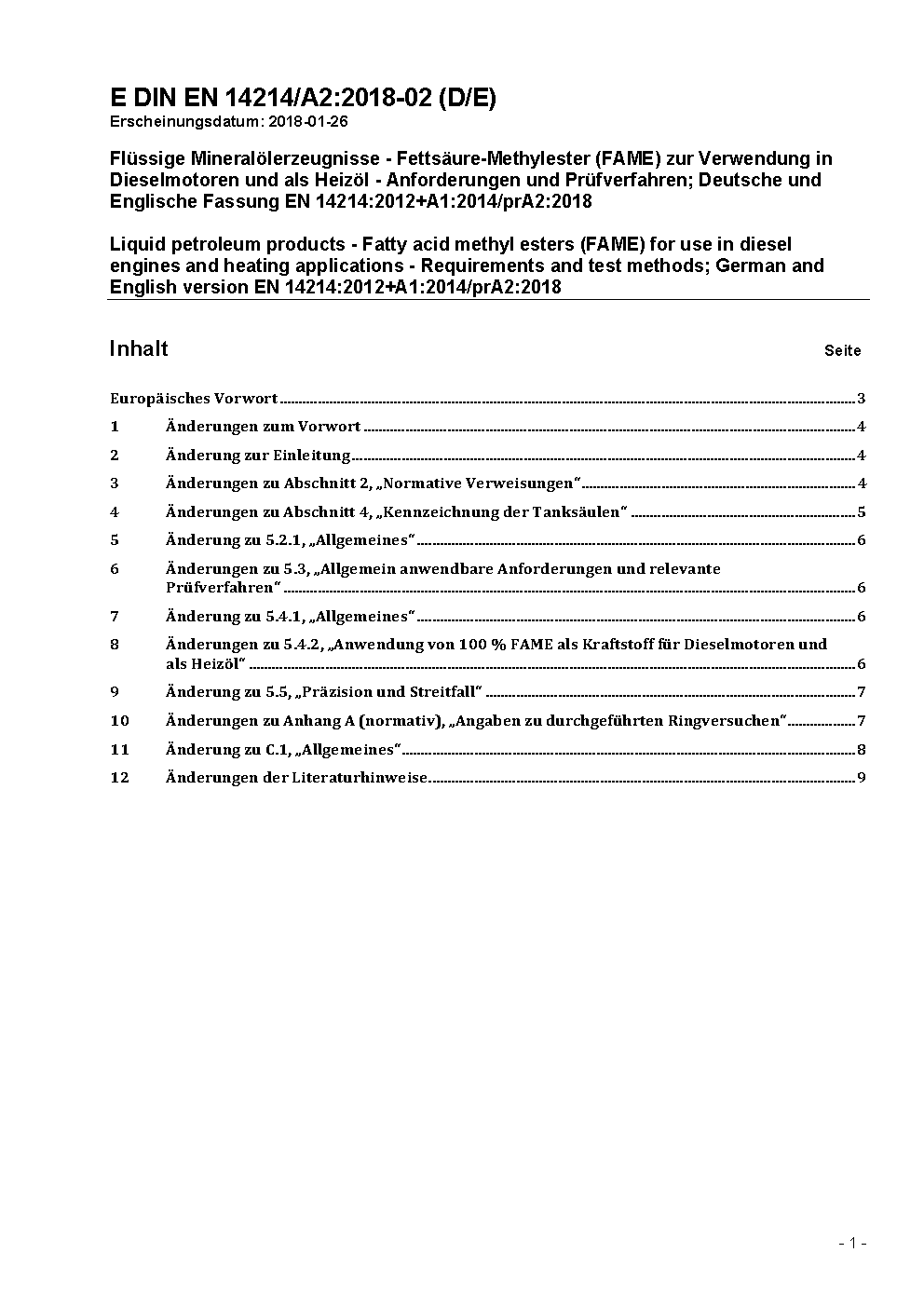 Liquid petroleum products - Fatty acid methyl esters (FAME) for use in diesel engines and heating applications - Requirements and test methods; German version EN 14214:2012+A1:2014