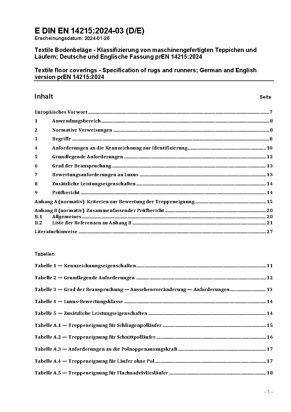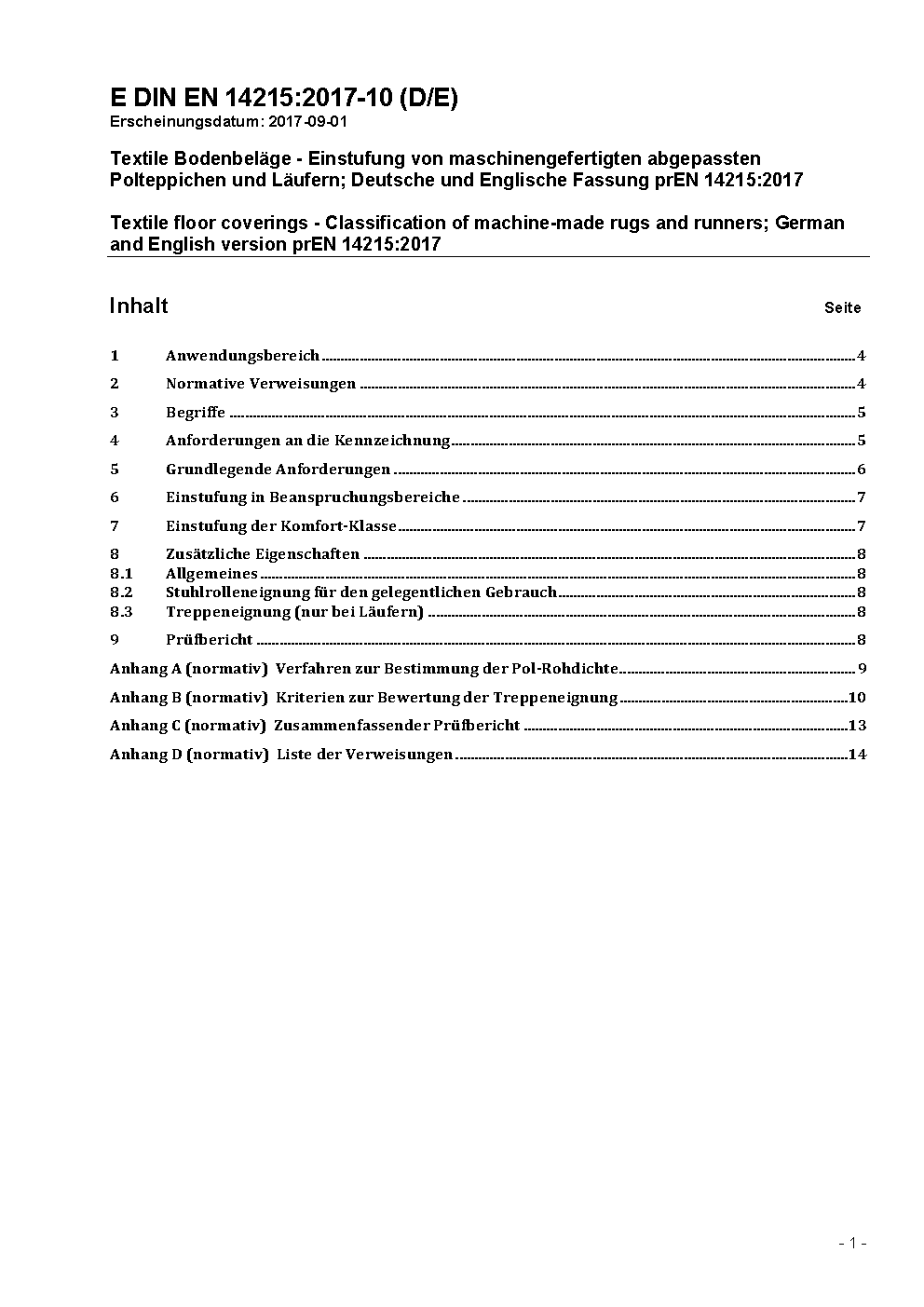 Textile Bodenbeläge - Einstufung von maschinengefertigten abgepassten Polteppichen und Läufern; Deutsche und Englische Fassung prEN 14215:2017
