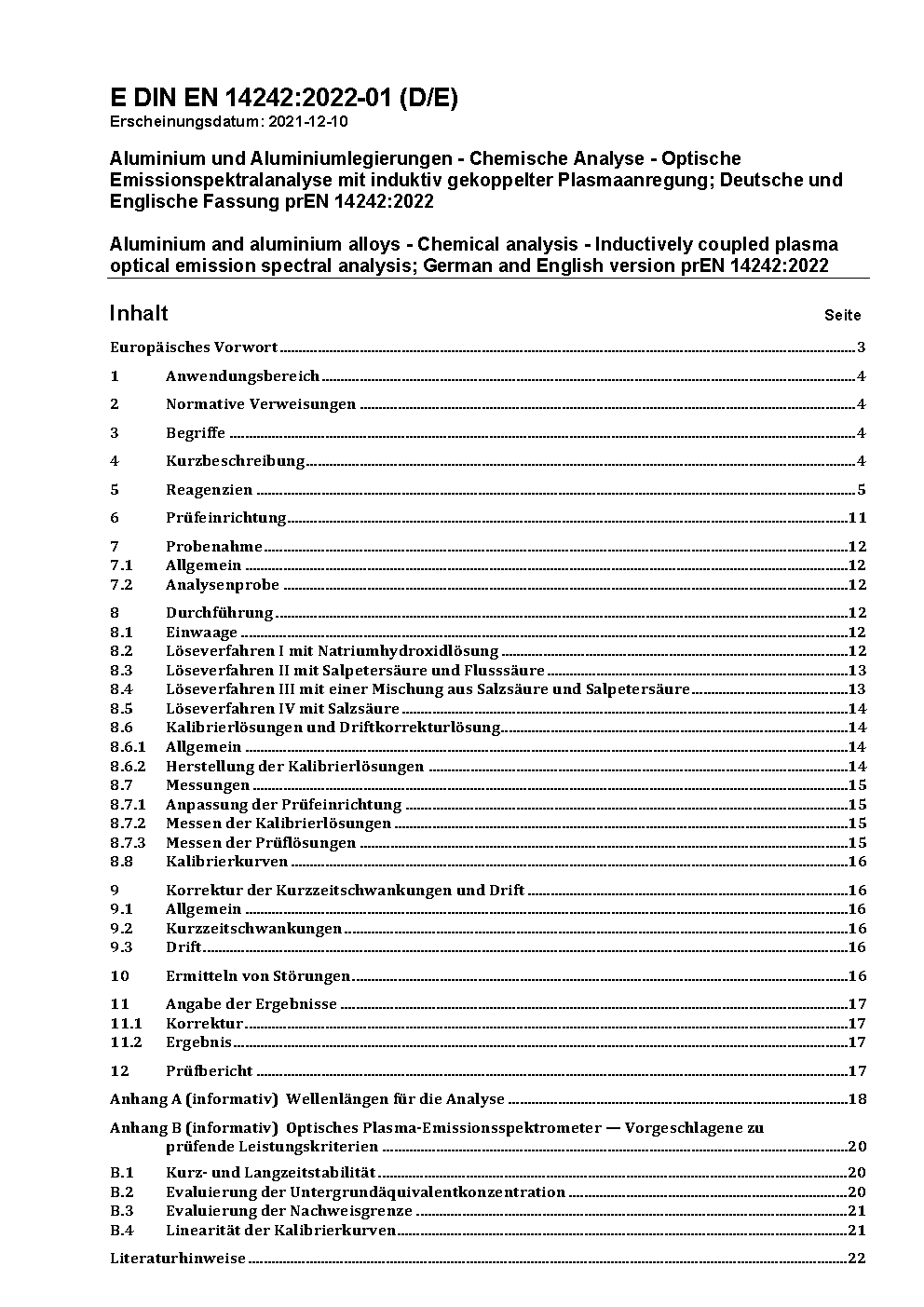 Aluminium und Aluminiumlegierungen - Chemische Analyse - Optische Emissionsspektralanalyse mit induktiv gekoppelter Plasmaanregung; Deutsche Fassung EN 14242:2004