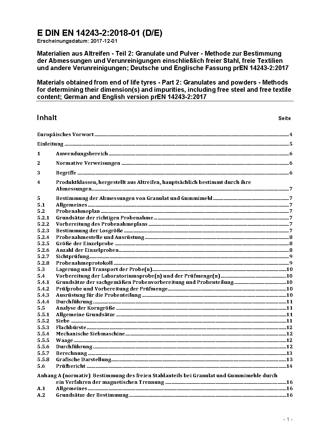 Materialien aus Altreifen - Teil 2: Granulate und Pulver - Methode zur Bestimmung der Abmessungen und Verunreinigungen einschließlich freier Stahl, freie Textilien und andere Verunreinigungen; Deutsche und Englische Fassung prEN 14243-2:2017