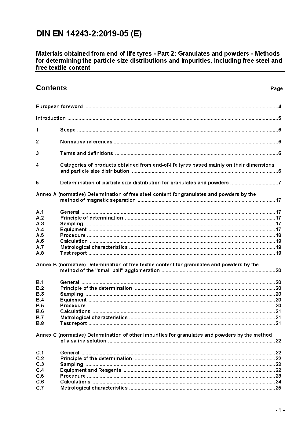 Materials obtained from end of life tyres - Part 2: Granulates and powders - Methods for determining their dimension(s) and impurities, including free steel and free textile content; German and English version prEN 14243-2:2017