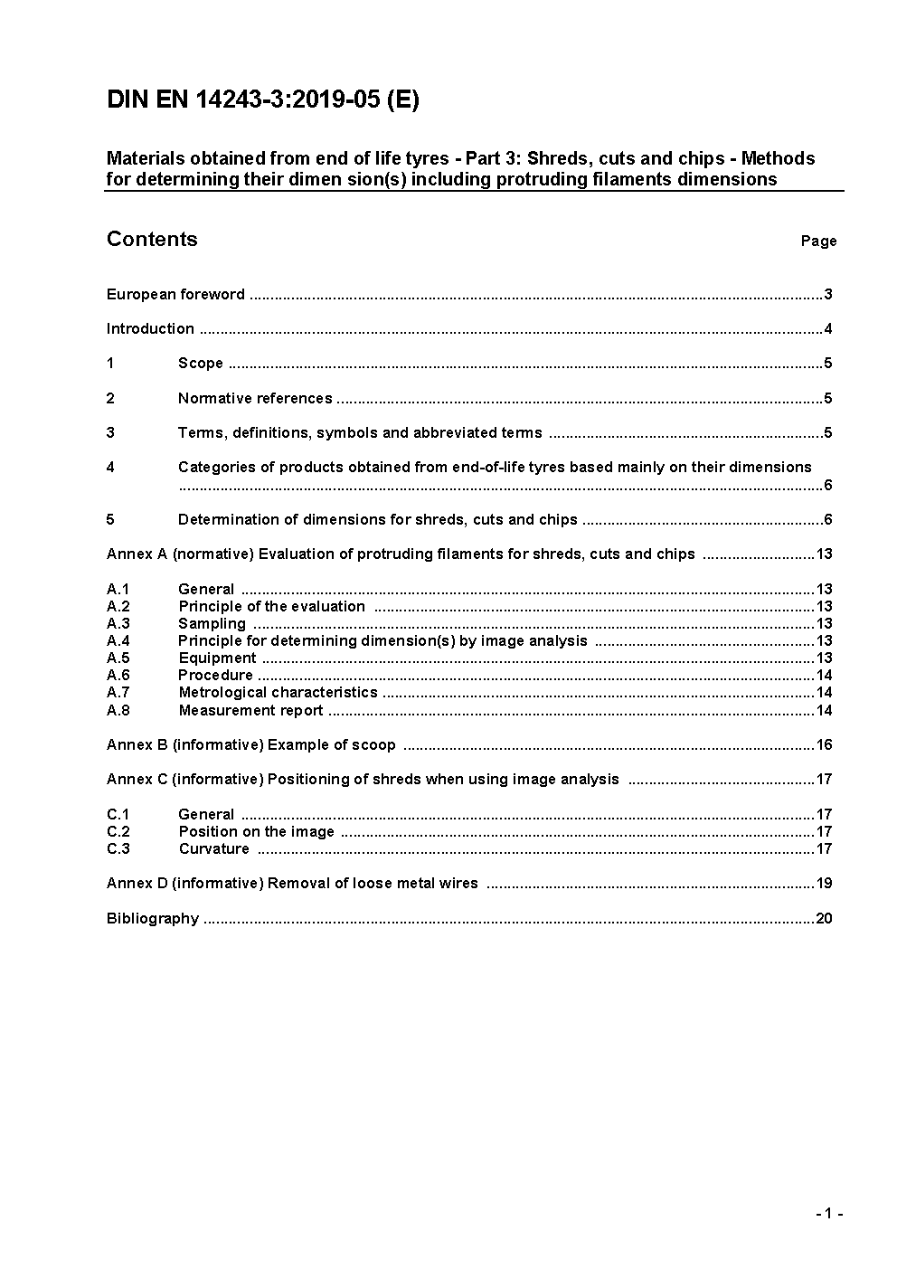 Materials obtained from end of life tyres - Part 3: Shreds, cuts and chips - Methods for determining their dimension(s) including protruding filaments dimensions; German and English version prEN 14243-3:2017