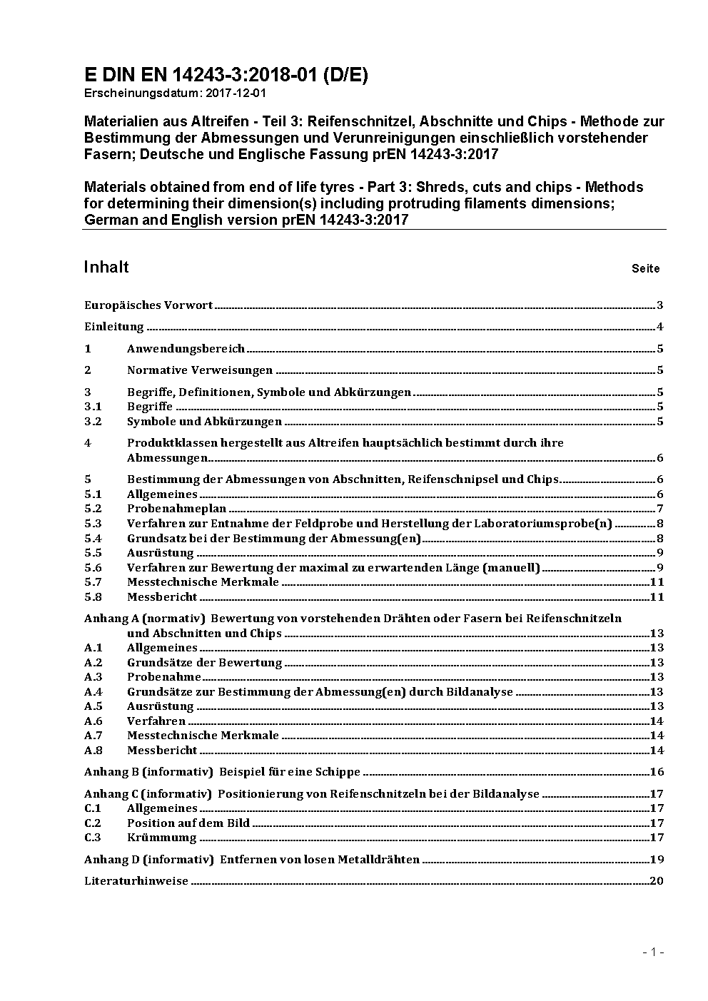 Materialien aus Altreifen - Teil 3: Reifenschnitzel, Abschnitte und Chips - Methode zur Bestimmung der Abmessungen und Verunreinigungen einschließlich vorstehender Fasern; Deutsche und Englische Fassung prEN 14243-3:2017