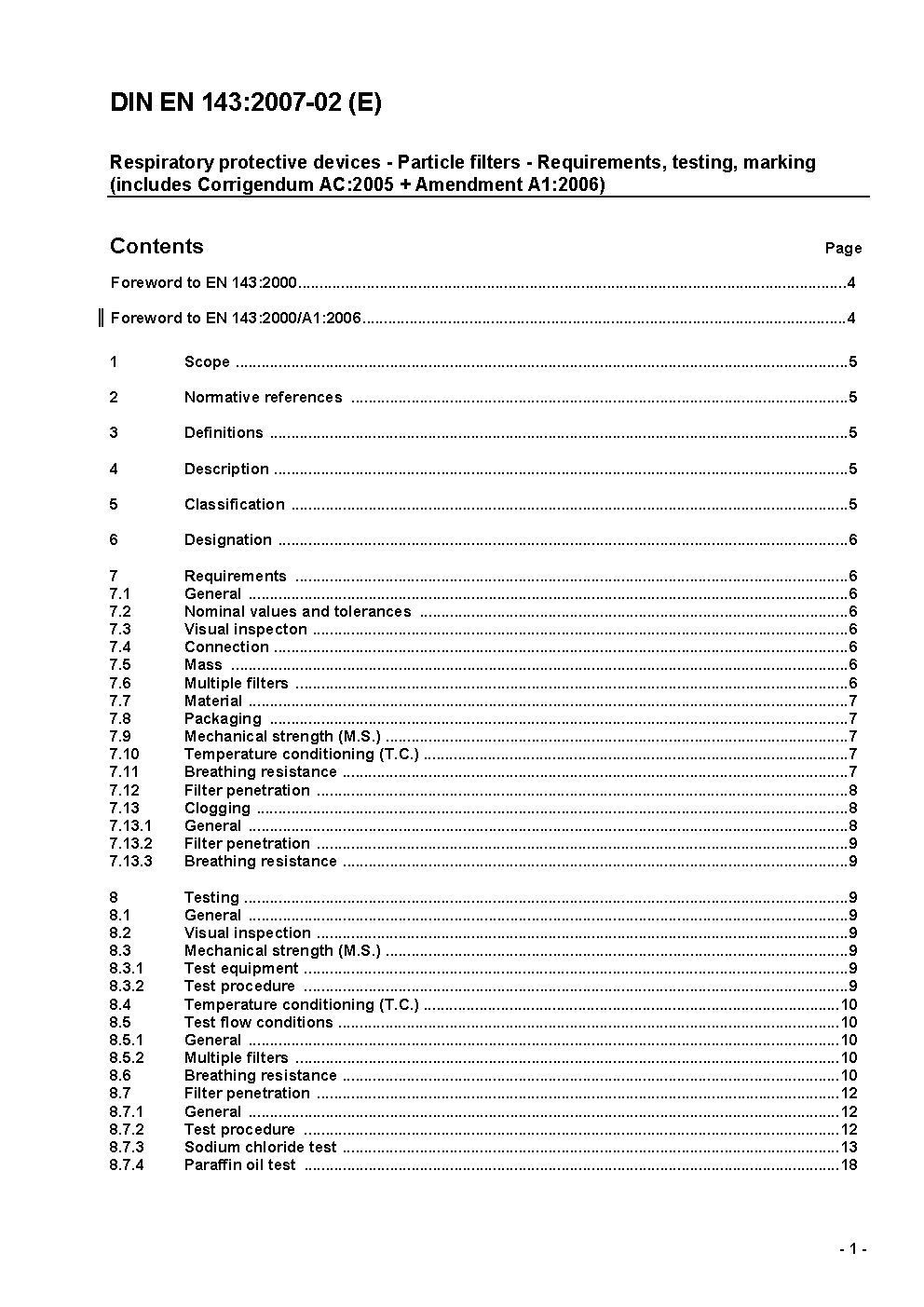 Respiratory protective devices - Particle filters - Requirements, testing, marking; German version EN 143:2000 + AC:2005 + A1:2006